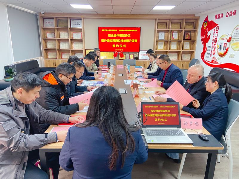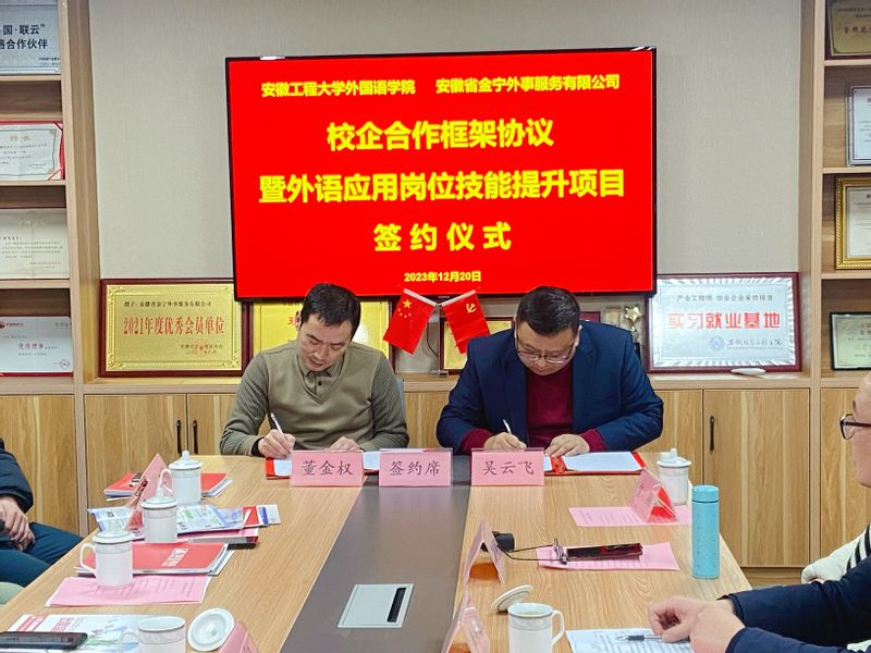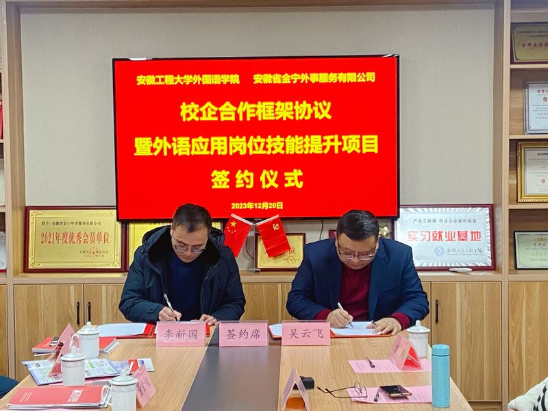 会上,外国语学院党委书记董金权、李新国分别与吴云飞签订校企合作合作框架协议和外语应用岗位技能提升横向项目协议。
