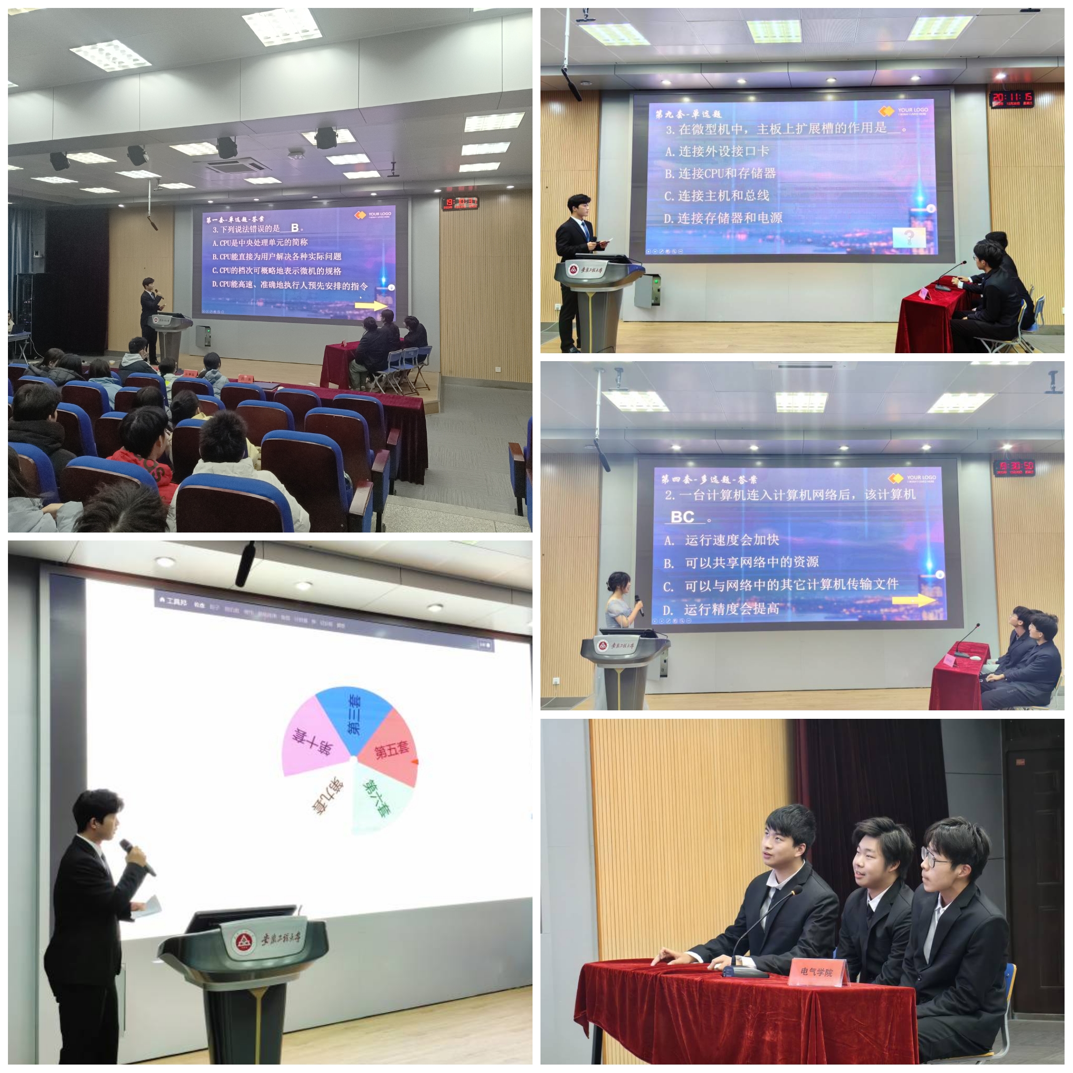 决赛现场,按照抽签顺序,进行现场抽题,实行“快问快答”,每道题的答题时间20秒,共分成单选题、多选题、判断题等。同学们凭借扎实的计算机基础知识,灵活的思维和出色的应变能力,充分展示了自己的才华和实力。上半场比赛开始后选手们迅速进入比赛状态,比赛现场井然有序。中场的观众抢答环节气氛非常热烈。在校团委、各学院的大力支持下,选手们的认真参与下,此次竞赛圆满结束。