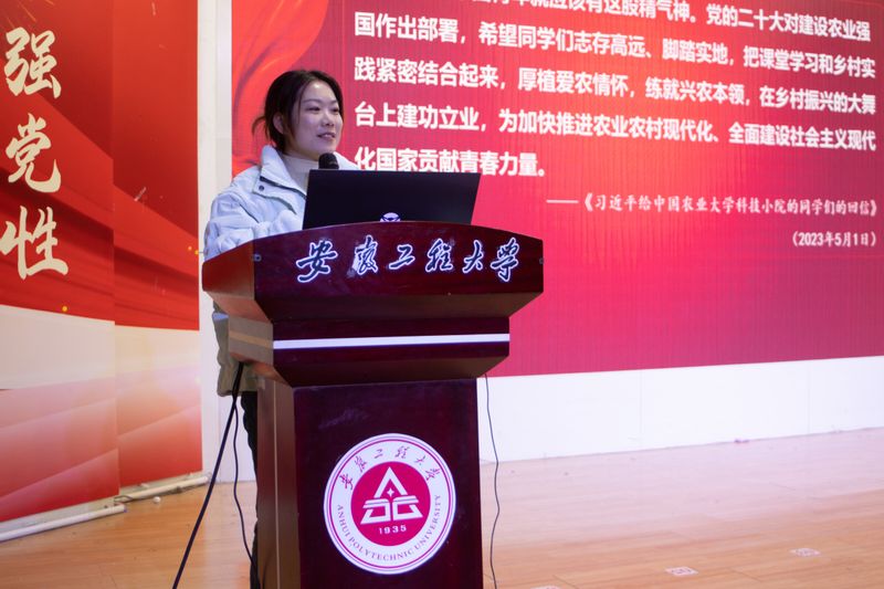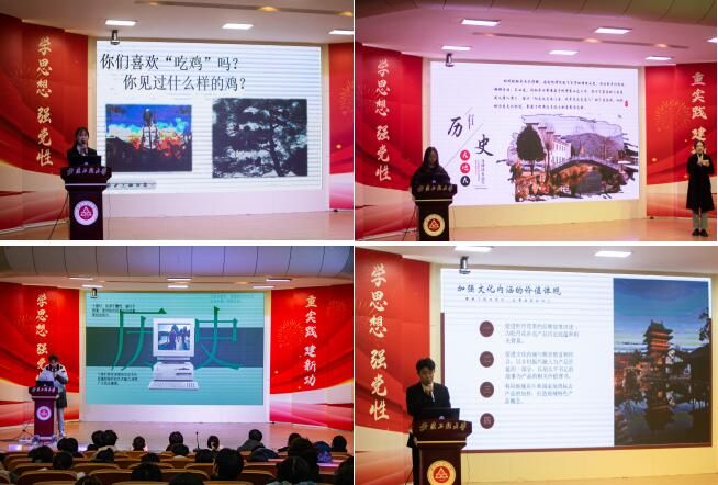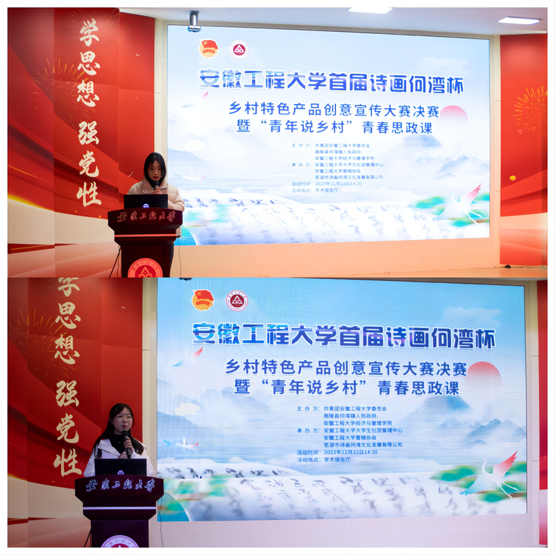 本次比赛以“青春创意助力乡村振兴”为主题,围绕南陵县何湾镇乡村特色产品进行宣传创意文案撰写和宣传视频推广,分为初赛、复赛和决赛三个环节。比赛吸引了来自经济与管理学院、设计学院等13个学院、50多个专业、80余支队伍报名参赛。进入复赛环节的20支队伍深入何湾镇开展素材采集和实践活动,不断丰富作品内涵。决赛现场,12支队伍围绕产品的品牌方案设计、创意包装、宣传推广、产品分销渠道等方面进行了阐述和答辩,展示了精心制作的宣传视频。纺织服装学院服设221赵雨晴同学、设计学院广告211彭倩文同学分别以“小画笔里的大故事”“乡村振兴里的青年故事”等为题分享了她们参加乡村振兴社会实践的经历和体会,讲述了青年学生眼中的“乡村故事”,以青春思政课的形式生动回答了“乡村振兴,青年何为”的时代之问。