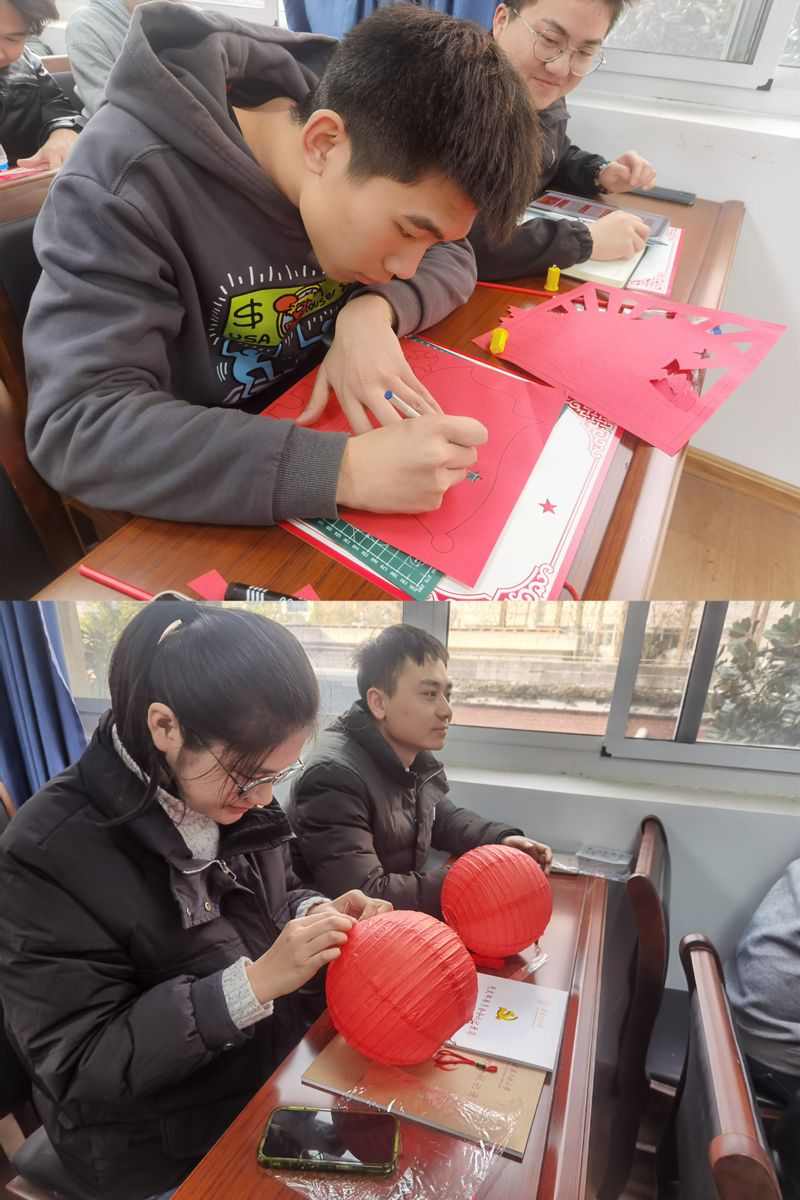 会上集中学习了习近平总书记在第十个国家宪法日之际作出的重要指示、习近平总书记在上海、广西考察时的重要讲话精神等内容。并对做好学院2023年度党支部书记抓基层党建述职评议暨党支部工作考核、规范使用《安徽工程大学党支部工作手册》、各支部开展诚信考试教育活动及期末学生安全离校等工作做出了布置。各党支部结合本年度支部工作,逐一分享这一年来“学得怎么样,做得怎么样,将来怎么样”,找差距和不足,明确未来的努力方向。在知识竞赛环节,每个支部选派三人参加,围绕党的基本知识、基本理论、党纪党章党规知识进行竞答,各支部你追我赶,竞争激烈,比赛现场气氛热烈。DIY手工灯笼制作及手工剪纸活动中,党员们共同剪纸“话”祝福,剪“祝福祖国”、剪“爱我中华”......剪纸过程中,大家互相切磋,互相交流,由易到难,大家纷纷拿着作品留念,记录自己的剪纸成果。在制作灯笼过程中,大家纷纷在灯笼上写上祝福,寄予新期望。
