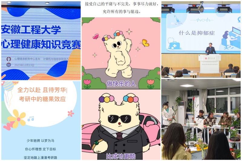 强化以智慧心,健全心智人格,激发学生认知力。充分利用网站、微信平台推送“‘全力以赴且待芳华’考研心理支持”“期末心理压力调适”等原创微文,为学生赋能减压;坚持以赛促学、以学促用,举办首届心理健康知识竞赛,吸引全校3779名同学踊跃参与,丰富学生课余文化生活;聚焦常见心理问题,开展抑郁症识别与应对专题讲座,为大学生抑郁症防治常见问题提供专业指导;组织“花与心世界”人际关系等系列团体辅导,通过音乐舒缓、肢体伸展、正念冥想等方式,提高同学们心理弹性及对应激事件的处理能力;开展“一纸心笺”心理健康书信、“徽程馨语 语暖心田”朋辈微文征集活动,让同学们在传递心声的过程中助力自我接纳与成长。