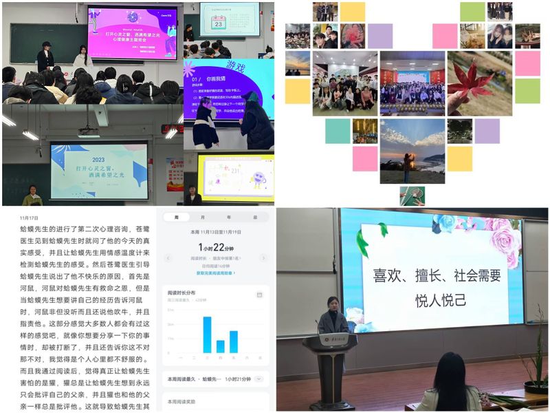 坚持以德育心,正确价值引导,发掘学生内动力。紧扣立德树人根本任务,强化显隐并举,将心理教育、思想教育融入教学实践活动,推进第二课堂实践与专业课堂教育的交通渗透。抓好《大学生心理健康与发展》课程思政建设,强化学生角色认知和责任担当,组织18名心理骨干参加“朋辈技能提升营”,230名新生心理委员参加培训;开展“21天效应”习惯养成活动,用量化的打卡方式使学生将习惯细化成具体的目标行为,激发学生改变潜能;举办感恩作品征集与幸福展活动,用文字和图片在校园里传递感恩与爱,鼓励同学们换一种温暖的视角看待世界;组织开展心理健康主题班会,引导学生对生命价值、自我价值和社会价值开展思考,以奋斗之姿书写青春华章。
