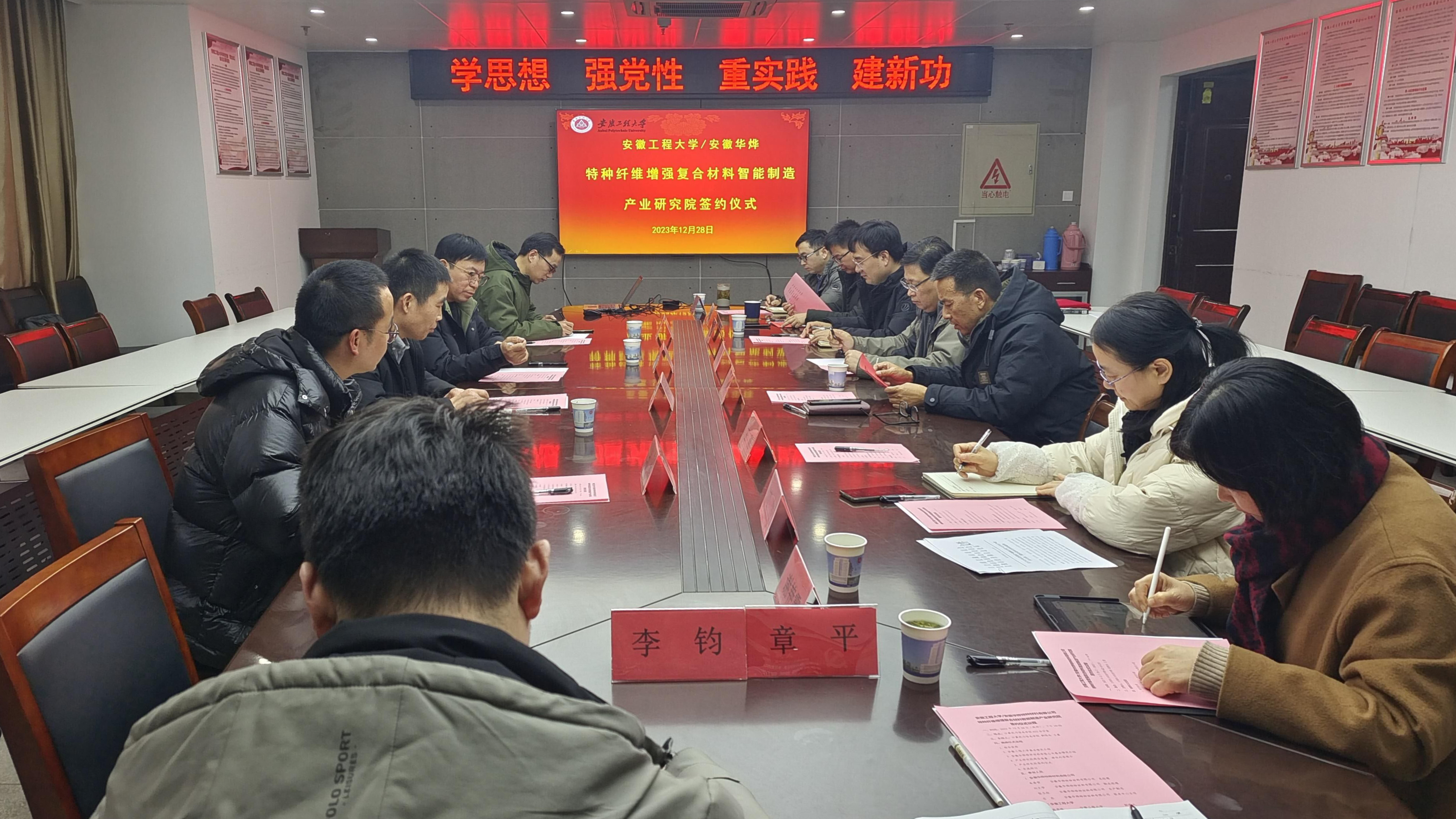 本网讯 12月28日,学校与安徽华烨特种材料有限公司(以下简称安徽华烨)共建的特种纤维增强复合材料智能制造产业研究院签约仪式在计算机与信息学院会议室举行。学校副校长高彦峰,安徽华烨总经理朱泽贺出席了此次活动。学校相关部门、计算机与信息学院、纺织服装学院有关负责人以及部分专业教师参加了本次活动。活动由计算机与信息学院副院长王勇主持。