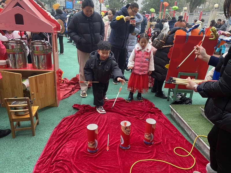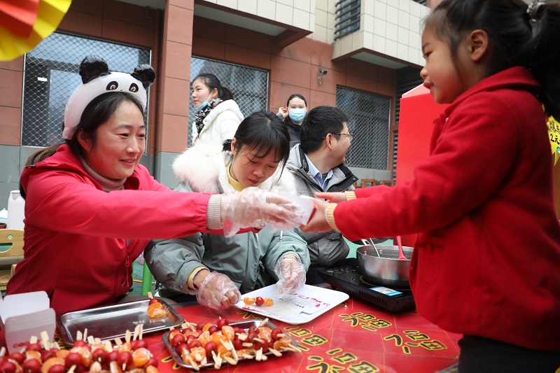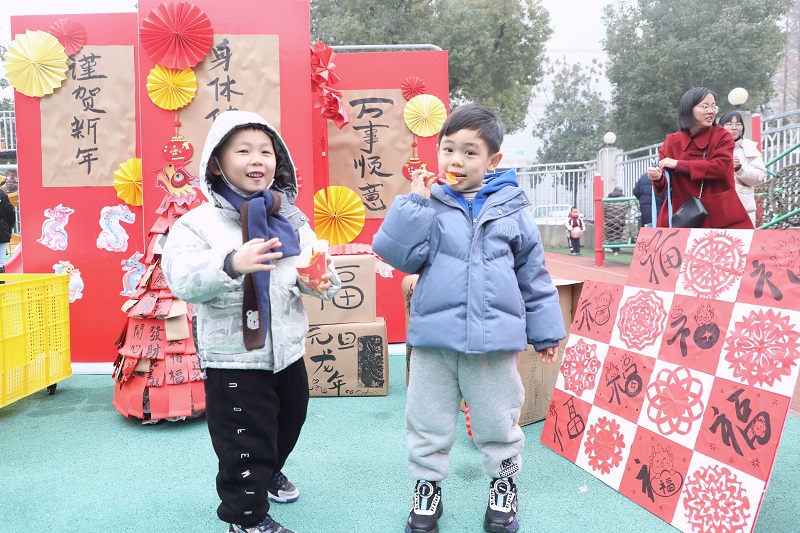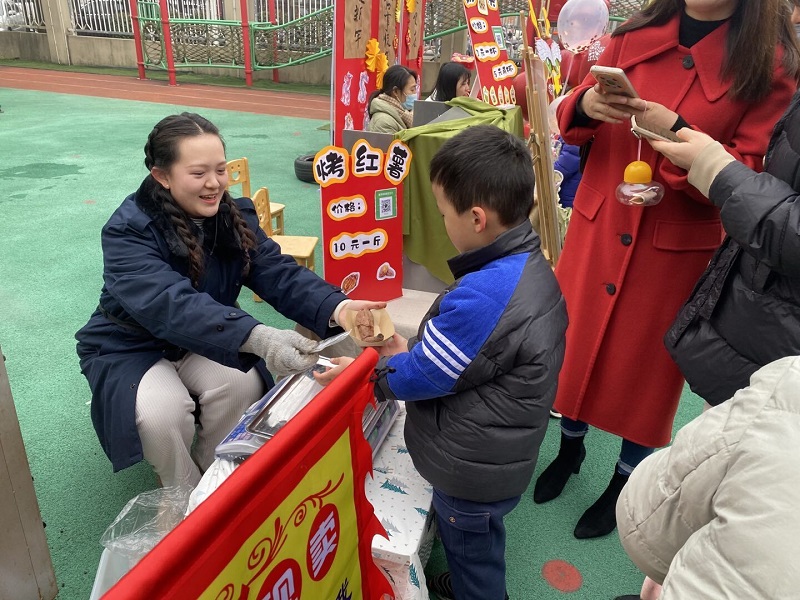 聚——喜庆满园。29日上午9点,小朋友们在家长的陪同下陆续到达活动现场。此时的幼儿园操场,张灯结彩、喜气洋洋,各式各样的摊位更是让人目不暇接。“卖冰糖葫芦喽”“又香又甜的烤红薯呦”……此起彼伏的吆喝声,从不同的摊位接连传来。孩子们手拿自己的小钱包忙碌地穿梭于各个摊位之间,自主选择,开心地参与各项民俗活动,在幼儿园里寻找年俗,享受年趣,品尝年味。