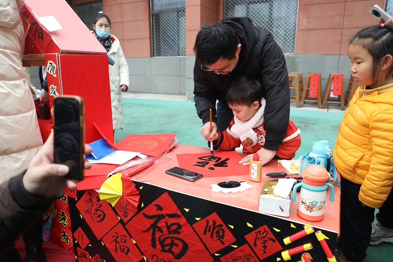 感——新年习俗。除了美食,传统民俗活动也让孩子们流连忘返。老师们精心准备了剪窗花、写百福、趣味投壶等传统民俗活动。孩子们专注、投入,一笔一画,一折一剪,与家长一起动手,写“福”字,剪窗花,在操作中体验到了传统节日的文化性、趣味性和多样性,加深了对传统节日的认识和了解。
