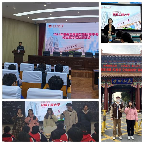 精心组织,广泛参与。来自全校16个学院的778名学生志愿者利用寒假走进130余所生源中学开展招生宣传活动。活动开展前,招生办老师对志愿者们进行了培训,就活动开展目的、宣传内容、安全管理、活动预案、往期经验等内容进行讲解和分享,鼓励同学们发挥主观能动性开展招生宣传,当好学校的代言人,讲好安工程故事,吸引更多优秀学生报考安徽工程大学。