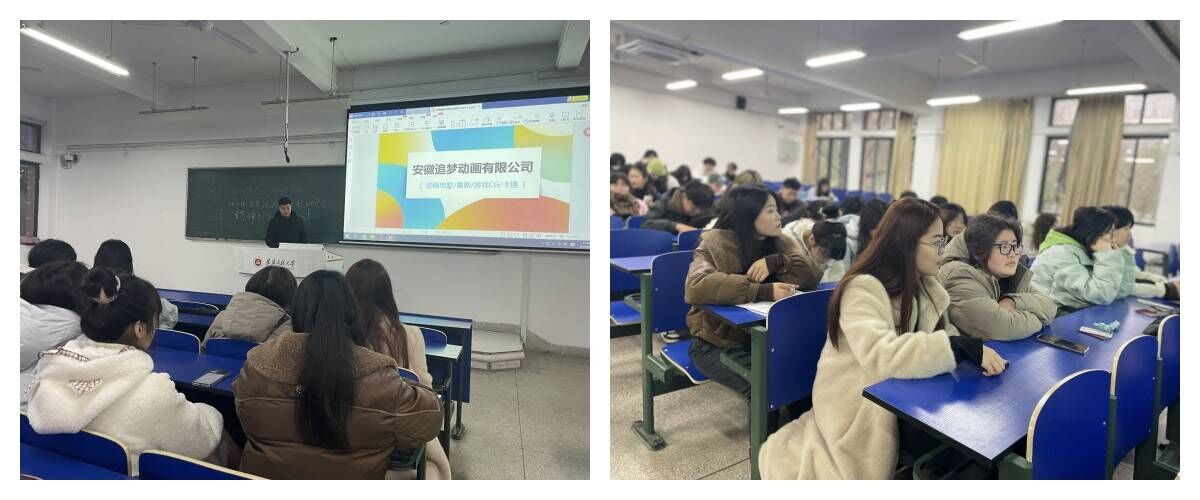 本次宣讲会的“主角”是来自杭州漫禾动漫有限公司和安徽追梦动画有限公司的企业代表。漫禾动漫的宣讲嘉宾胡斌帅为我校2004级工业工程专业校友,他满怀感激之情地回顾了母校对他的栽培与教育,分享了自己在职业道路上的成长与奋斗,为同学们提供了宝贵的职业规划建议。两家企业分别介绍了公司的发展历程、核心业务、人才培养策略以及校园招聘计划,与毕业生现场进行了互动交流。宣讲会现场,还有不少低年级学生前来聆听,他们表示希望在校期间多参加此类活动,了解目前就业形势,找准就业方向,提前为日后职业做好规划。