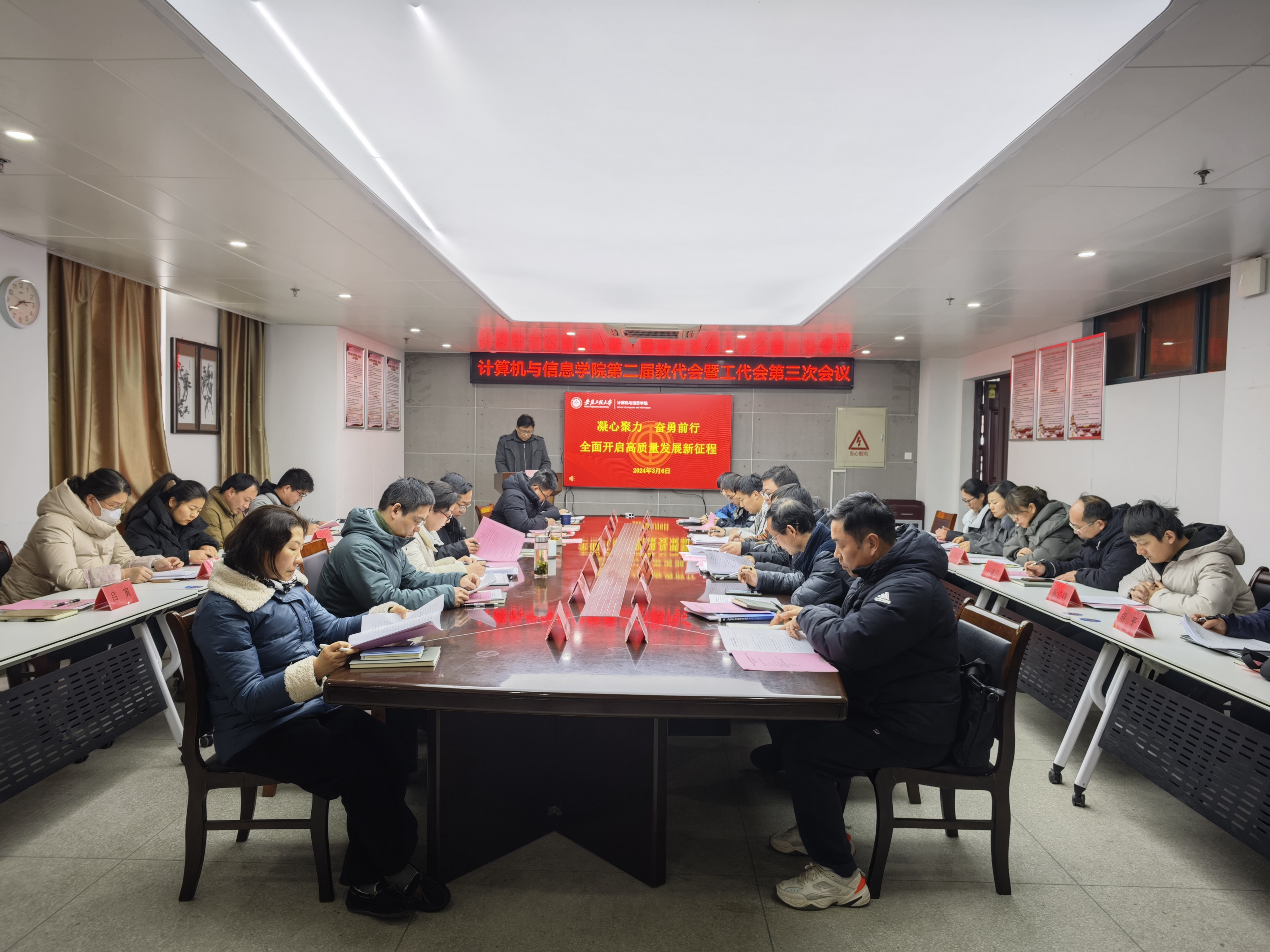 本网讯 3月6日,计算机与信息学院第二届教职工代表大会暨工会会员代表大会第三次会议在C座622会议室召开。学院全体代表参加会议,会议开幕式和闭幕式分别由学院党委书记李卫东,党委副书记、院长汪军主持。