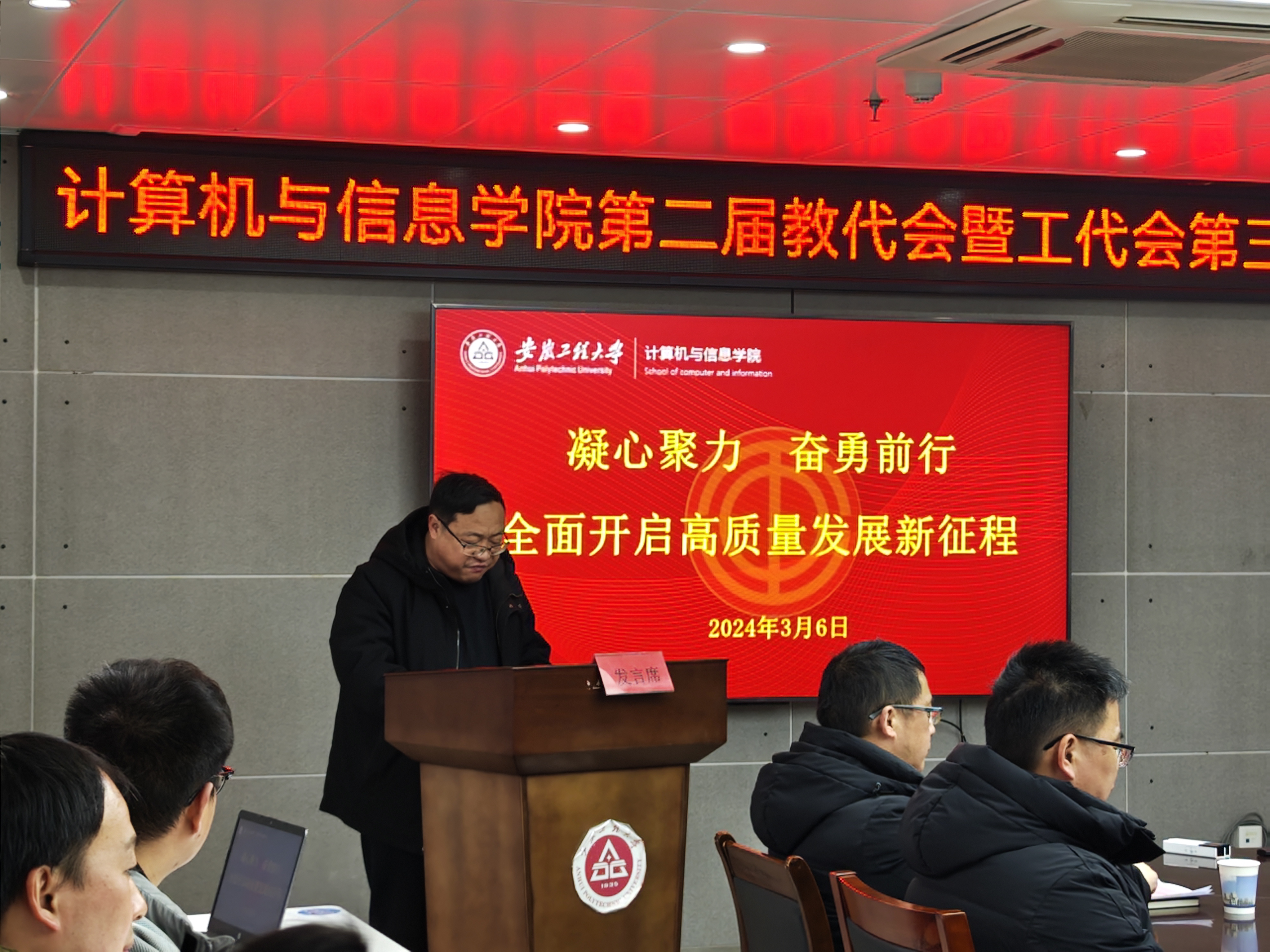 大会在庄严的国歌声中拉开帷幕,汪军作题为《凝心聚力奋勇前行全面开启高质量发展新征程》的工作报告,报告从深化教育改革,推动人才培养、学科与队伍建设、科学研究与社会服务能力、学生工作、综合管理等方面回顾总结了学院2023年的工作,并结合学校重点工作提出了学院2024年工作发展思路和目标任务。学院分工会副主席周文娟作题为《团结擎动力 和谐促发展 为奋力谱写学院高质量发展新篇章保驾护航》的工作报告。