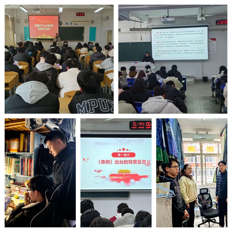 青年广学,团员群众全覆盖。学院严格落实主题班会制度,3月1日至3月7日,学院专兼职辅导员对所有班级实现新学期主题班会全覆盖,并将学习马克思主义宗教观、《中国共产主义青年团纪律处分条例》等规章制度作为班会的主要内容之一,把坚持党的领导贯彻落实到对全体团员的教育、管理、监督全过程,把纪律挺在前面,注重抓早抓小、防微杜渐。学院辅导员在走访寝室中,与学生开展深入交流,从寝室卫生到人际关系,从学习状况到思想动态,面对面教育引导学生要增长智慧,增强信心,用青春唱响“强国复兴有我”的时代强音。