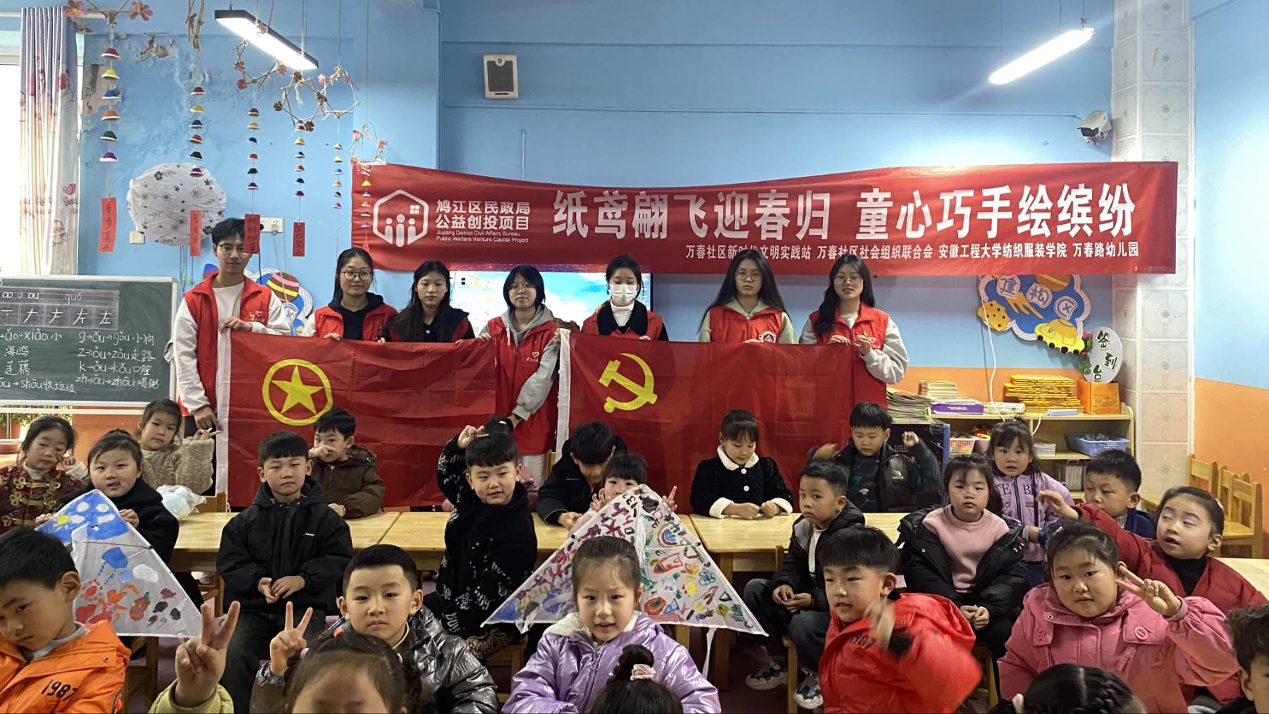 3月13日,团队成员带着制作风筝的材料与工具来到芜湖市万春社区,向当地小朋友们介绍风筝的起源与发展,分析风筝中常用的吉祥图案,讲解风筝形状的构造。团队成员绘声绘色的解说不仅赢得了小朋友们的掌声,更点燃了小朋友们动手制作的热情。在志愿者的引导下,小朋友们迫不及待地对风筝进行组装,并化身小小“童画家”,在风筝蒙面上与彩色笔墨来了一场特殊的约会。天马行空的创意在笔尖呈现,每一只风筝都有着独特的生命力和灵魂。