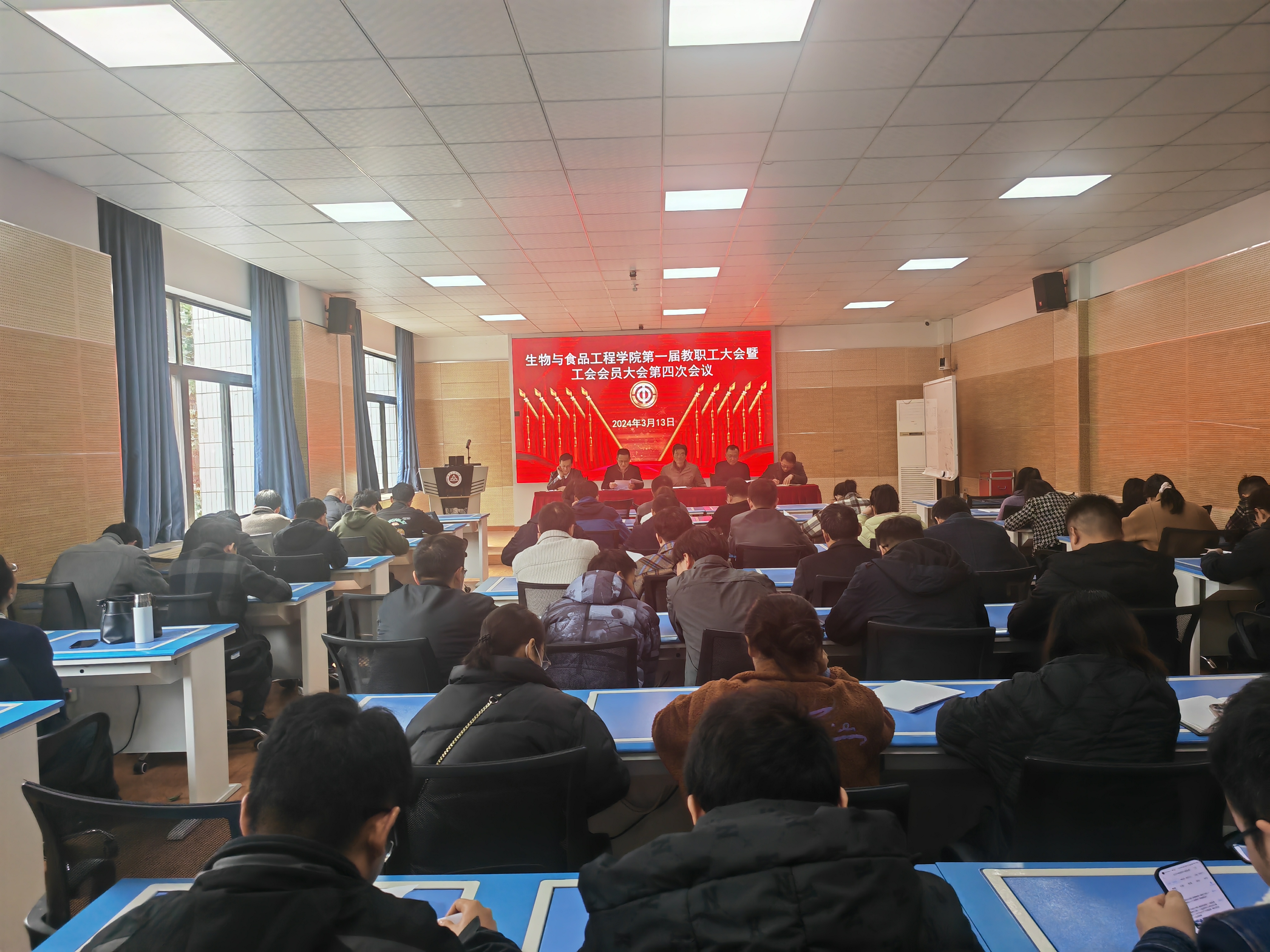 本网讯 3月13日,生物与食品工程学院在虚拟仿真中心召开第一届教职工大会暨工会会员大会第四次全体会议。学院全体教职工参加会议,会议由学院党委书记余传文主持。
