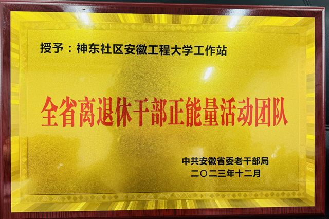 本网讯 近日,省委老干部局公布了2023年度全省老干部调研、宣传、信访工作优秀单位,我校荣获“全省老干部信访工作优秀单位”荣誉称号。同时,在全省离退休干部正能量活动团队、正能量活动之星评选中,我校“神东社区安徽工程大学工作站”荣获“全省离退休干部正能量活动团队”荣誉称号。