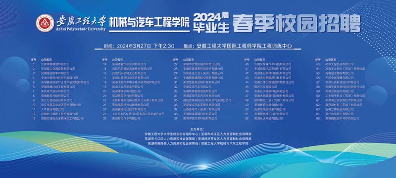 本网讯 为落实稳就业保就业决策部署,全力促进2024届毕业生高质量就业,3月27日,机械与汽车工程学院在国际工程师学院校区实训中心举办2024届毕业生春季首场双选会。本次双选会提供约800个就业岗位,得到了校大学生就业创业指导中心、校团委、芜湖市相关区(县)人社部门大力支持。