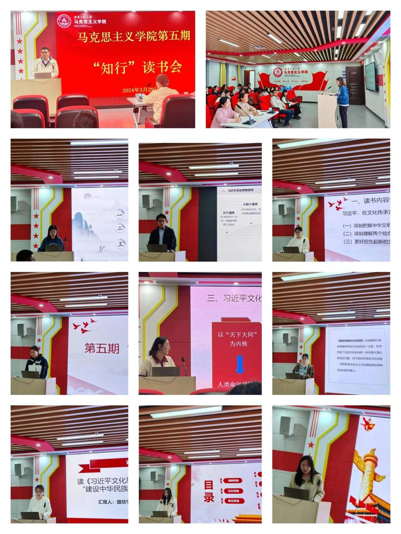 学院研究生匡诗敏、刘洋、李晓婉、杨杰、沈翠、徐丹、盛欣宇、程菲儿、魏欣悦等9人围绕习近平文化思想学习研讨这一主题,从自己感兴趣的内容着手,分享了自己的读书方法与心得体会,从革命文化、文化自信、“两个结合”等多个方面进行讲述,从不同的角度阐述了自己对于学习习近平文化思想的感悟。