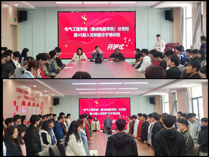 本网讯 为深入学习贯彻习近平新时代中国特色社会主义思想和党的二十大精神,深入贯彻落实新时代党的建设总要求和新时代党的组织路线,做好对入党积极分子的培养教育工作,4月9日,电气工程学院(集成电路学院)分党校第45期入党积极分子培训班开班式在国际工程师学院龙胜楼206会议室举行。