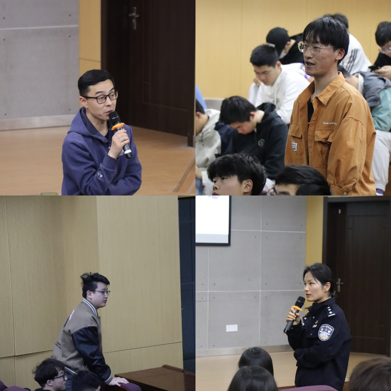 现场观众积极参与提问答疑阶段,围绕“大学生面对电诈诈骗应该注意哪些事项?大学生遇到电信诈骗应该怎么做,怎么有效预防?”等问题展开讨论交流,城东派出所民警汪家丽、李有文,保卫处赵荣俊分别给予现场解答,并用鲜明生动的案例和令人瞠目的数字警醒大学生要时刻提高警惕,谨防诈骗。