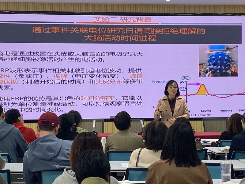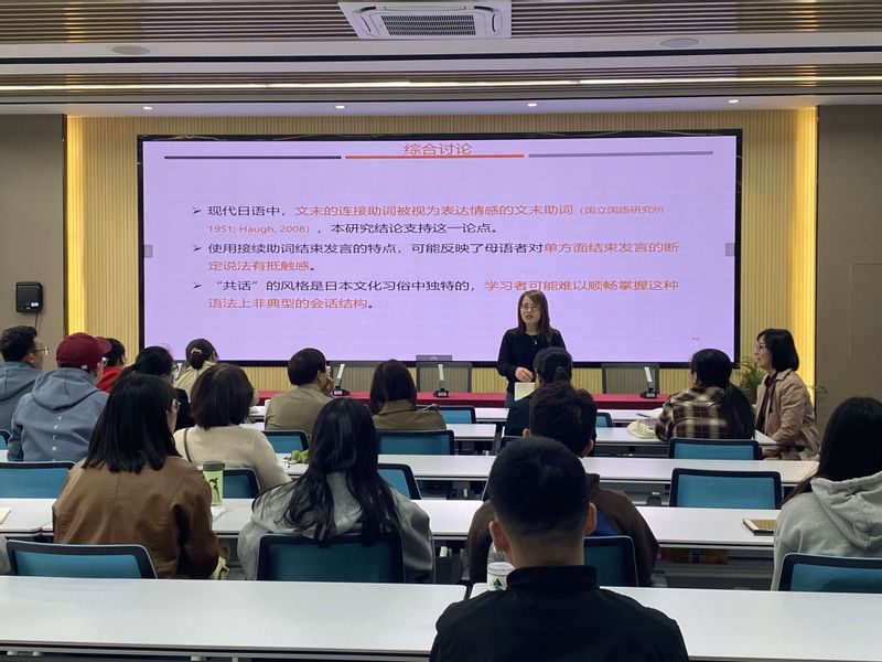 汪敏博士作了题为“日语中间接拒绝理解的神经语言学研究:母语者与学习者的对比分析”的学术报告。汪博士从人际关系交往中间接拒绝的现象和特点出发,提出了开展实证研究探讨母语者和学习者理解间接拒绝现象的心理和神经基础。报告通过采用功能性磁共振成像(fMRI)和事件相关电位(ERP)等神经生理学方法,对日语母语者与日语学习者在处理间接拒绝未完结句时的机制进行了详尽的对比分析,揭示了日语母语者在理解涉及人际关怀表达间接拒绝时的未完结句大脑活动的空间定位,明确了母语者与相对不太熟悉日本语言习惯和文化习俗的日语学习者在处理这种句子时大脑活动的时间序列上的差异化特征。本研究通过被试的神经反应平均值及其个体差异,为人际关系会话风格会根据连续的个体特性发生变化提供了科学证据。在讨论环节,老师们就fMRI和ERP两种实验的偏好以及特色、被试对象的遴选、低心智化能力学习者的研究等问题与汪敏博士进行了深入探讨和交流。