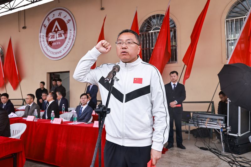 校党委副书记、校长卢平致开幕词。他指出,今年是中华人民共和国成立75周年,也是中华体育健儿出征巴黎奥运会、进一步激发人民群众参与体育运动热情的“奥运之年”。学校始终将体育教育工作放在突出位置,推动“三全育人”综合改革落地,创新性提出“三全六专”育人实践,坚持抓习惯养成促进学生“壮”起来。他要求,运动员要勇于拼搏,以最佳状态投入比赛,赛出佳绩、赛出水平;各学院、有关部门要善于团结,细致做好本次运动会的保障工作,精心组织、坚守岗位;广大师生要乐于健身,要以此次运动会为契机,积极参加健身活动,享受乐趣、增强体质、健全人格、锤炼意志。他给全体师生无畏风雨、顽强拼搏的精神点赞。