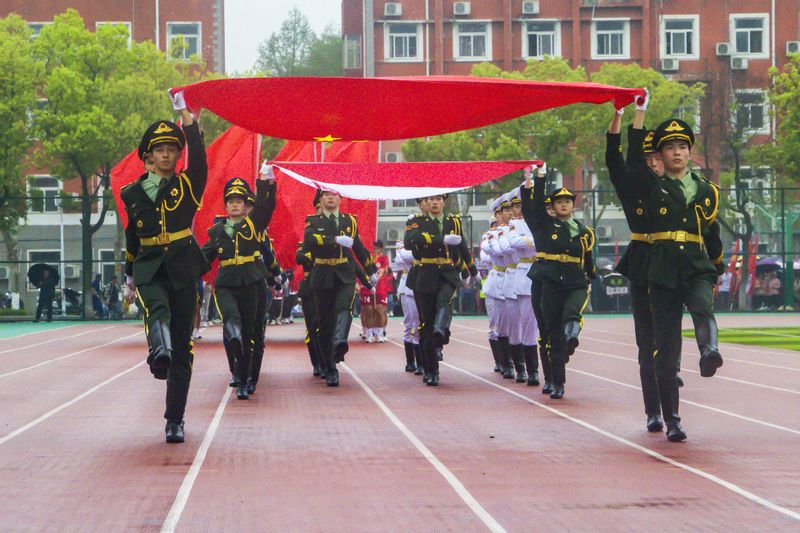 上午8时,伴随着振奋人心的《运动会进行曲》,国旗班高举鲜艳的五星红旗、校旗,迈着铿锵有力的步伐走过主席台并接受检阅。裁判组、青年志愿者代表队以及其他各方阵有序入场。