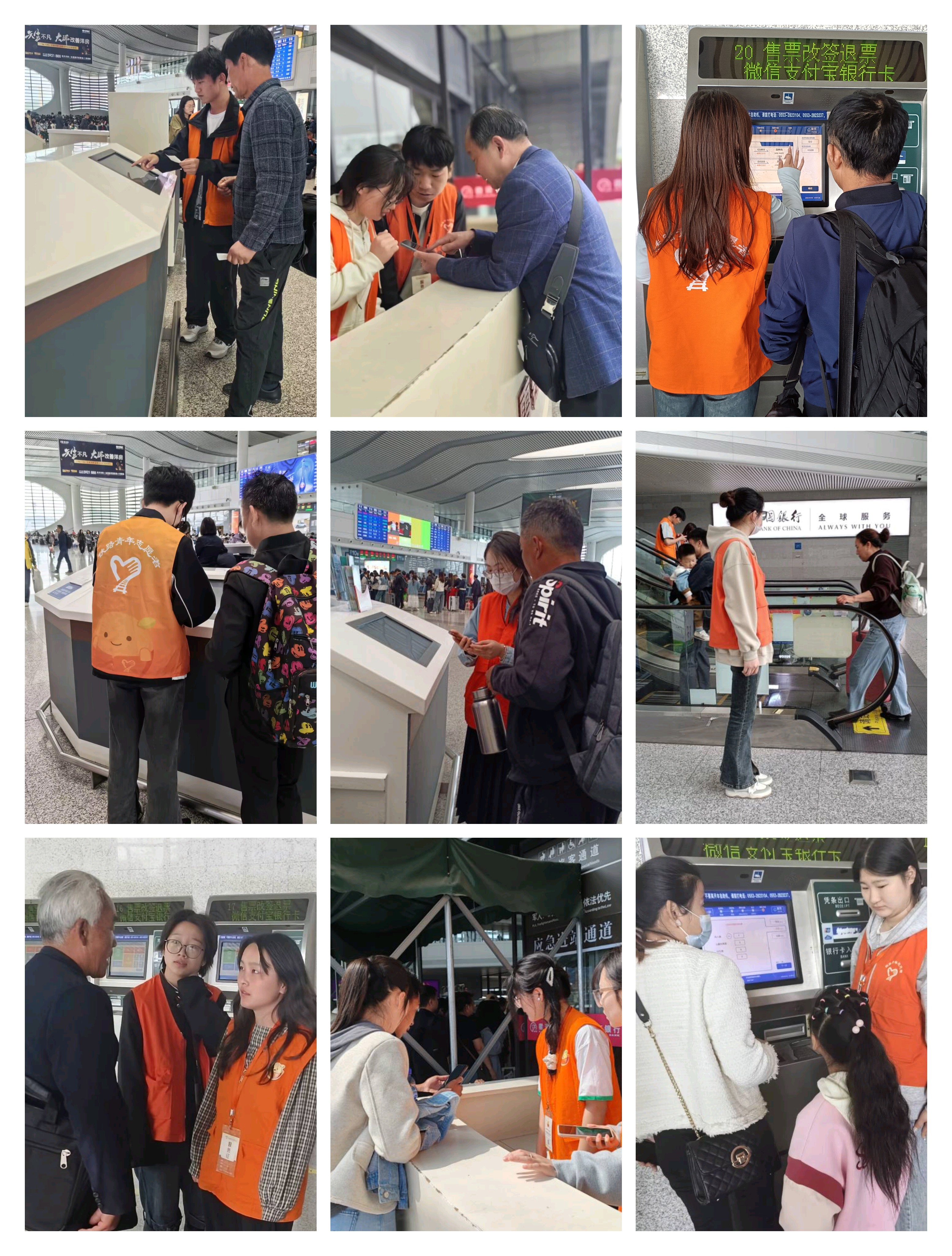 今年劳动节期间,芜湖站发送旅客48.7万人次,到达48.4万人,其中客流高峰日为4月30日。在芜湖站的大力支持下,本次志愿服务活动顺利开展。持续时间长、规模大是本次活动的两大特色,报名参加志愿服务人数达260人,有效接受志愿服务的旅客达数千人。本次活动主要在东进站口、东扶梯口、西扶梯口、东进站口雷锋服务台、二楼雷锋服务台以及母婴室等六个地点开展,主要内容有引导乘客有序排队、解答乘客疑问、帮助乘客搬运行李及改签车票等。“小甜橙们”忙碌的身影正是青春最美的写照,展现出志愿者们热情周到的服务态度和甘于奉献的精神风貌。