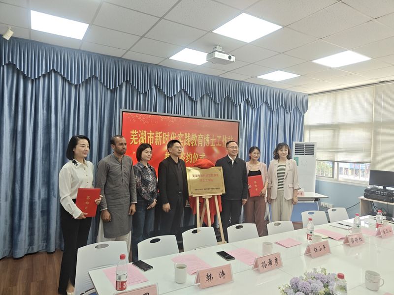 本网讯 5月10日,我校与芜湖市少年宫共建的“芜湖市新时代实践教育博士工作站”揭牌。出席签约揭牌仪式的有芜湖市教育局党委委员、副局长伍小平,芜湖市教育局团委副书记孙彦希,芜湖市少年宫主任韩涛,体育学院体验产业学院相关负责人等。