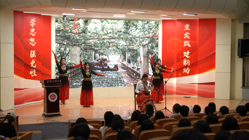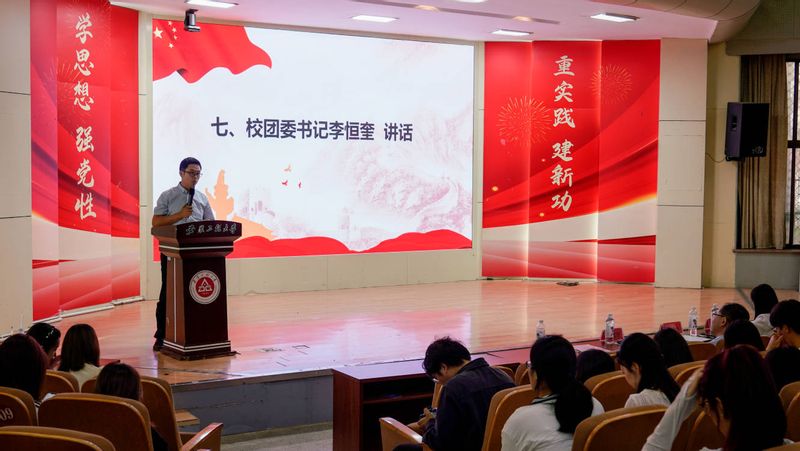 与会人员集中学习了习近平文化思想,感悟思想伟力,坚定文化自信。学院艺术教育中心表演传统器乐节目《葡萄熟了》,展示了民族文化的独特魅力。统计221班邢子康带领大家研读《青年团的任务》。校“十佳”大学生、金融211班阮友慧围绕“青年讲校史”主题讲述青春思政课,激励青年学子勇于担当、敢于创新,为中国式现代化贡献青春力量。“好青年志在四方,哪里是人民最需要的地方,就在哪里绽放光芒!”西部计划志愿者统计191崔方朔向同学们介绍了西部地区的发展现状及志愿者的工作生活情况,鼓励更多青年投身于国家最需要的地方,增进了同学们对西部地区发展的了解,也激发了服务西部的热情。