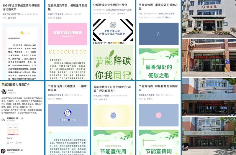 身体力行,开展节能活动。后勤保障处立足《安徽工程大学2024年节水节电工作方案》对校园节能降耗、低碳生活用能情况开展专项检查,及时发现问题、反馈问题、解决问题;计算机与信息学院开展“节能降碳、你我同行”座谈会和张贴节能标语,让节能理念在学生行动中体现;环保协会开展“节能减排行为每日打卡”和参观碳中和实验室活动,吸引了众多学生参与;图书馆和后勤保障处结合工作实际,在图书馆和食堂开展“节能降碳,从我做起”的主题签名活动,让学生身体力行从身边点滴小事做起,用实际行动支持绿色校园建设。