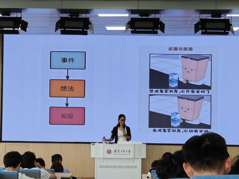 罗主任结合多年教学工作及精神科门诊经验,从大学生的现实生活出发分析了大学生常见的学业、生活、人际、情感等心理困扰,引导同学们通过对生理、情绪、认知和行为信号的识别及时觉察自我压力反应。继而以常见的抑郁症、焦虑症为例,在自我测试基础上,向同学们普及疾病相关知识,进行专业化解读。罗主任从认知、情绪和行为层面为同学们提供了一系列切实可行的应对方法,如转换角度以纠正不合理认知;保持积极心态,使情绪得到有效表达;从明确目标、有氧运动、寻求帮助等途径付诸行动,从而学会在接纳的基础上改善与压力的关系。