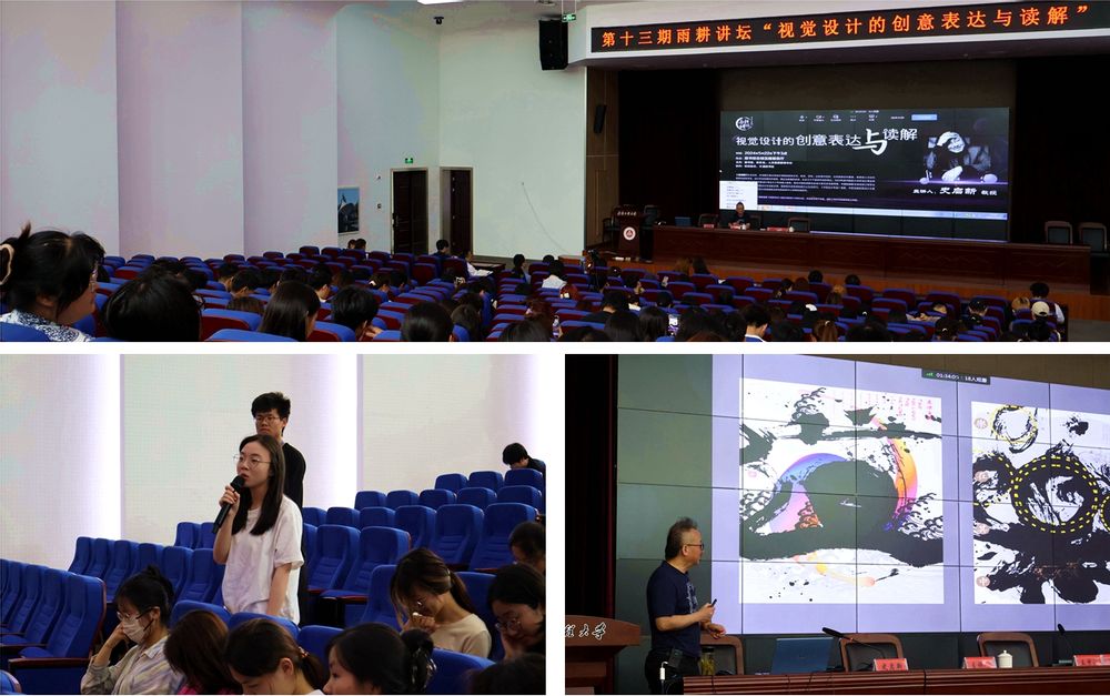 史启新以解读多幅通俗易懂的创意图形作为开场,为不同专业背景的师生们展示了通过图形传播创意和表达想法的奇妙之处。他表示,每个人心中都有无数的创意,只要将心中的好奇心和想象力发挥出来,就能形成创造性思维。他通过解读国内外获奖海报作品,启发人们通过联想可以获得无尽的创意,并将之用于日常生活中。他还谈到了AI技术对视觉设计的影响,AI可以帮助人们实现创意,让更多的人实现艺术创作。史启新还为现场师生分享和解读了他从业几十年来设计的多幅获奖作品,出色的创意表达引发了现场听众纷纷称赞。在讲座的互动环节,同学们积极提问,史启新对同学们的疑问耐心解答,并与现场师生共同探讨了视觉设计的发展趋势和未来方向。