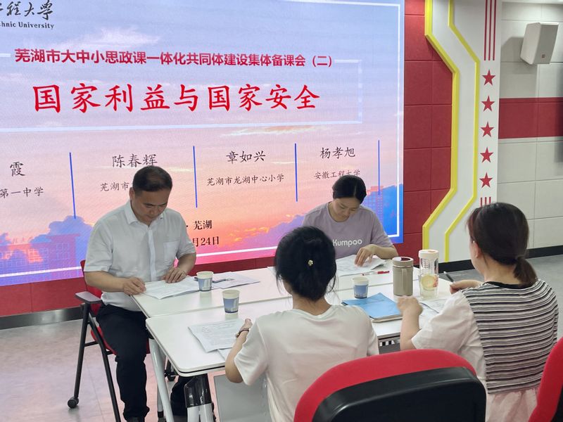 本网讯 为深入贯彻落实习近平总书记关于学校思想政治理论课建设的重要指示精神和教育部《关于开展大中小思政课一体化共同体建设的通知》要求,扎实推进芜湖市大中小学思政课一体化共同体建设,5月24日,我校举行芜湖市大中小学思政课一体化共同体建设第二次集体备课会。马克思主义学院教学副院长刘德军,芜湖市龙湖中心小学校长章如兴,芜湖第一中学思政教师吴霞,芜湖市第二中学“道德与法治”教师陈春辉,马克思主义学院思政课教师杨孝旭参加会议。会议由刘德军主持。