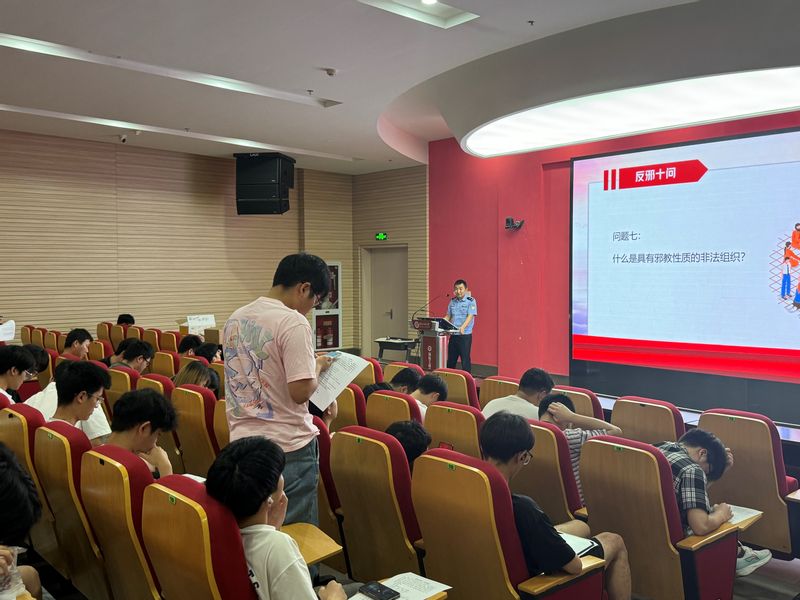 万春派出所警官陈仁文分别从“什么是电信诈骗、电信诈骗学生案例、电信诈骗常见套路、如何应对骗局以及如果被骗了怎么办”几方面深入浅出剖析电信诈骗,让同学们对电信诈骗有了更全面的认识。通过观看反邪教宣传视频,陈仁文从“什么是邪教、邪教的危害、如何识别邪教、防范邪教”等方面与同学们进行了交流研讨;他希望同学们要树立抵制邪教、崇尚科学的坚定信念,做到不听、不信、不传播邪教。同时呼吁同学们共同营造安全、健康、文明、和谐的网络环境,尊重真相,切勿传播网络谣言。