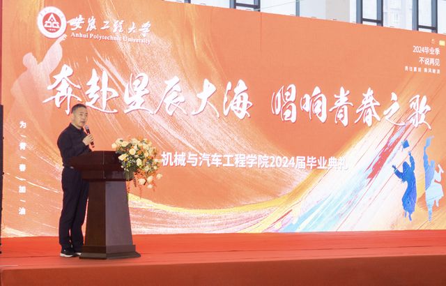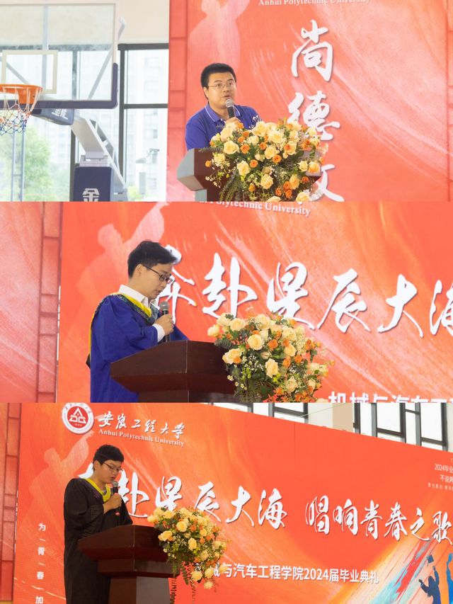 机械与汽车工程学院党委副书记秦广虎宣读了《关于表彰2024届优秀毕业生和毕业生先进个人的决定》。机械工程系副主任王风涛代表全院教师表达了对同学们的祝贺与嘱托,希望同学们能够坚定信仰,将个人发展融入国家需求;坚定理想,用奋斗架起通往成功的桥梁;常怀感恩,保持纯真与善良。方旭、朱哲枭分别作为毕业研究生、本科生代表发言,他们回顾了自己的求学生涯,表达了对学校的感谢之情,展望了未来的美好生活,表示会带着母校的祝福与期待,脚踏实地走好未来的每一步。