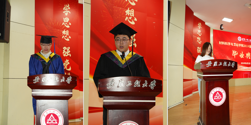 研究生代表蒋建同学、本科生代表邓仡同学代表全体毕业生向辛勤付出的领导老师们表示衷心的感谢,并祝愿母校永葆青春,桃李天下。教师代表陈静博士祝贺同学们顺利毕业,希望即将步入人生新篇章的同学们能永葆热爱,奔赴山海,期待着同学们在追梦路上的捷报和喜讯。