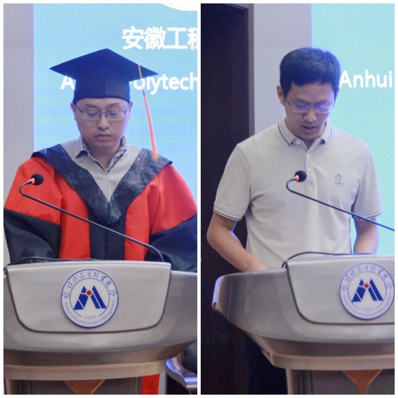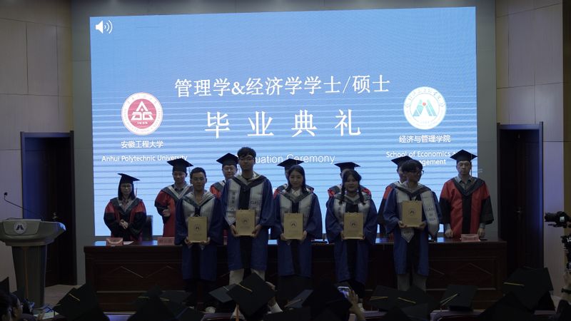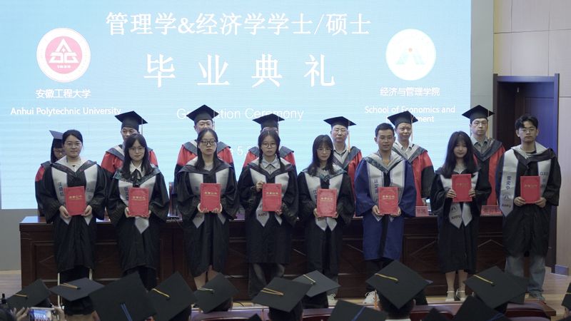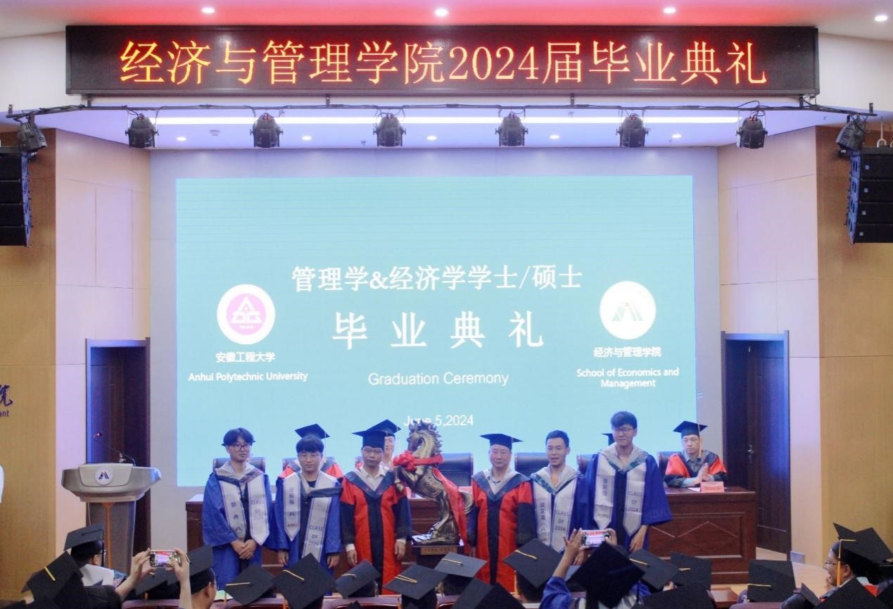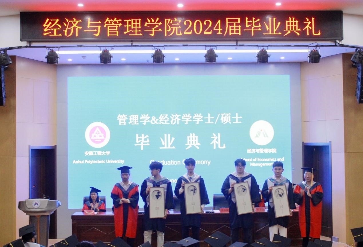 学院党委副书记、院长龚本刚宣读《关于表彰安徽省2024届优秀毕业生的通报》,副院长桂云苗宣读《关于表彰安徽工程大学2024届优秀毕业生的通报》,主席台就坐的领导老师为2024届优秀毕业生颁发证书。副院长蔡书凯宣读《经济与管理学院2024届研究生拟录取博士生喜报》,现场为考博成功同学颁发纪念品。通过表彰先进,不断弘扬“尚德敏学、唯实惟新”的校训精神,推动落实“三全六专”育人实践,让学生在“正”起来、“学”起来、“壮”起来、“乐”起来、“勤”起来、“和”起来方面不断比学赶超,推动学院院风、教风、学风更上新台阶。
