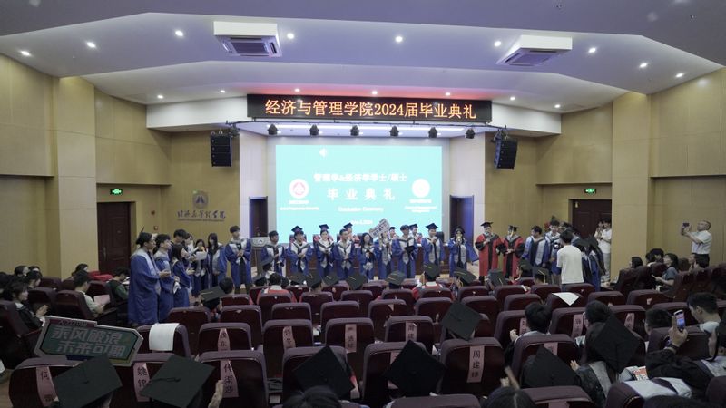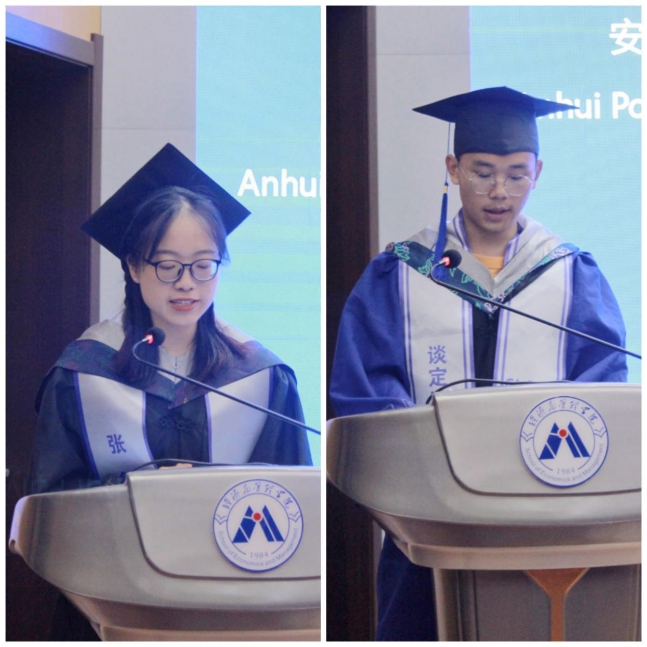 工商201班张舒发言表示,感谢四年来母校提供了学习的平台,感谢老师用辛勤的汗水浇灌成长,感谢同学一路陪伴,将带着大学期间收获的纯粹、坚定、真诚和炽热,去到各行各业,去到天南海北,去到祖国和人民需要的地方,以实现中华民族伟大复兴为己任,继续发挥我们经管青年的光和热,在全面建设社会主义现代化国家的火热实践中奋发有为、不负韶华!管科2021级研究生谈定波表示,三年的研究生学习,不仅学到了扎实的专业知识,更培养了自己的创新思维和实践能力,将以“德学双馨、济世经纬”为指引,奉献自己的智慧和力量。