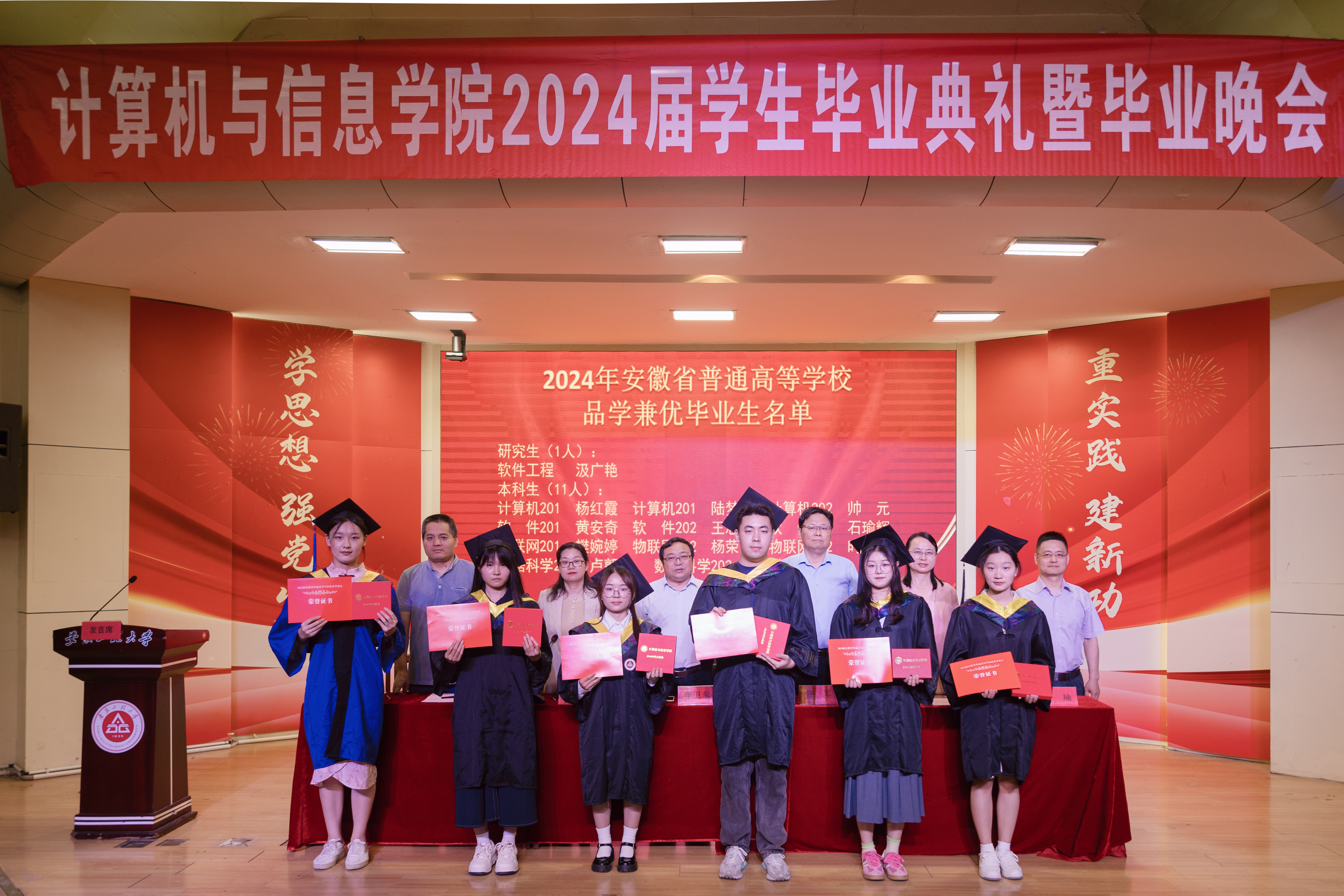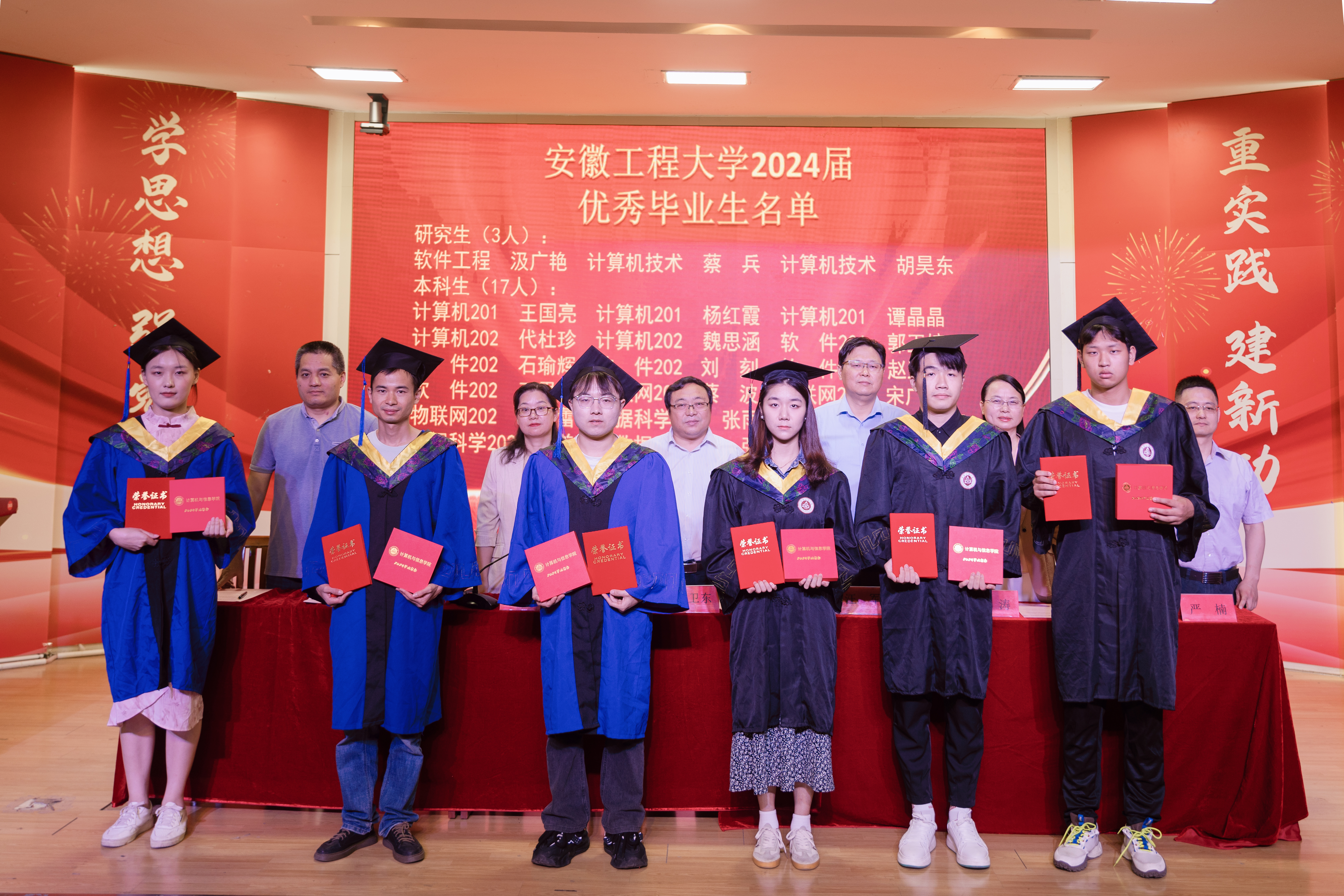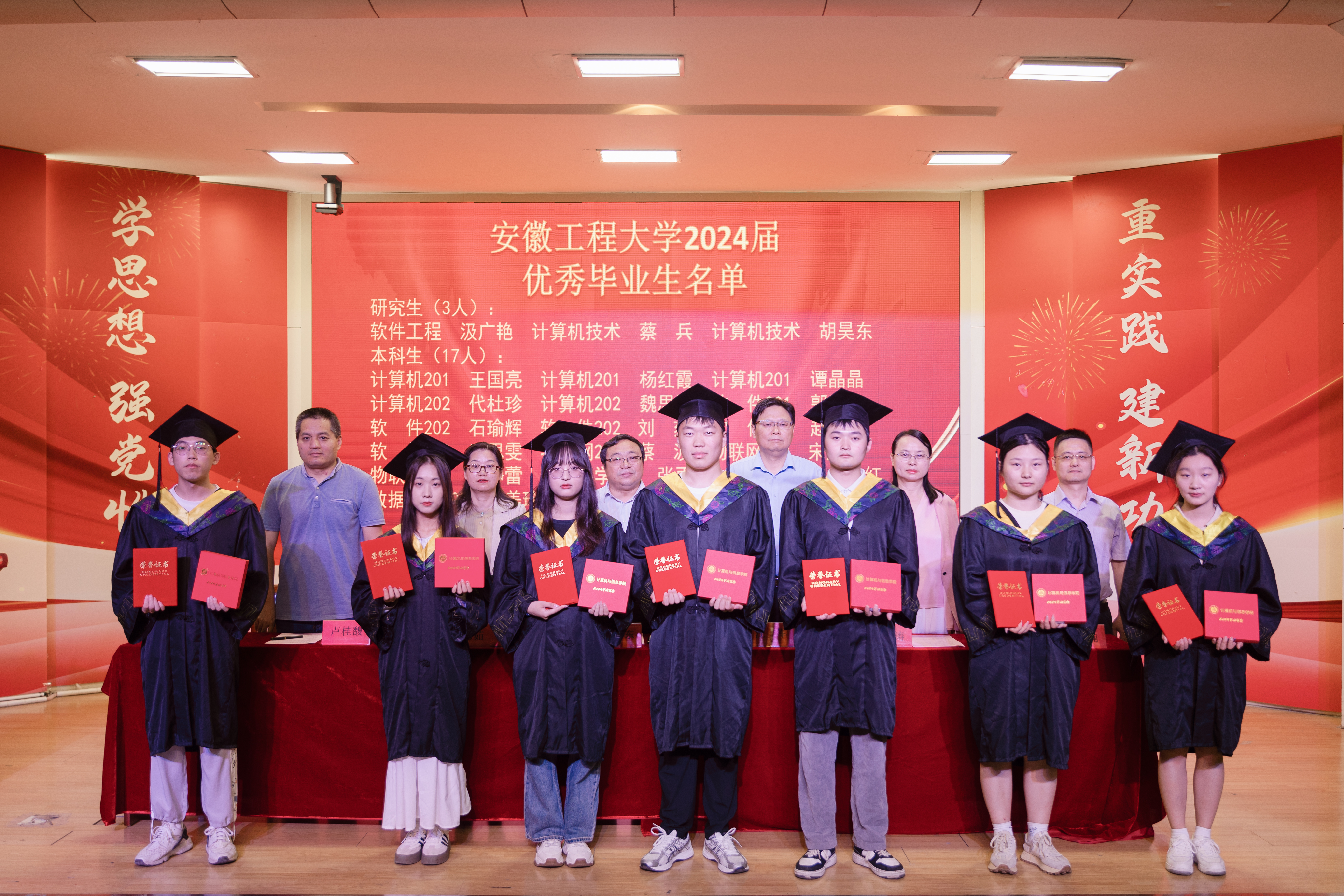 汪军宣读2024年安徽省普通高等学校品学兼优毕业生表彰名单,刘涛宣读安徽工程大学2024届优秀毕业生名单,学院领导和老师代表为优秀毕业生颁发荣誉证书并赠送毕业纪念品。