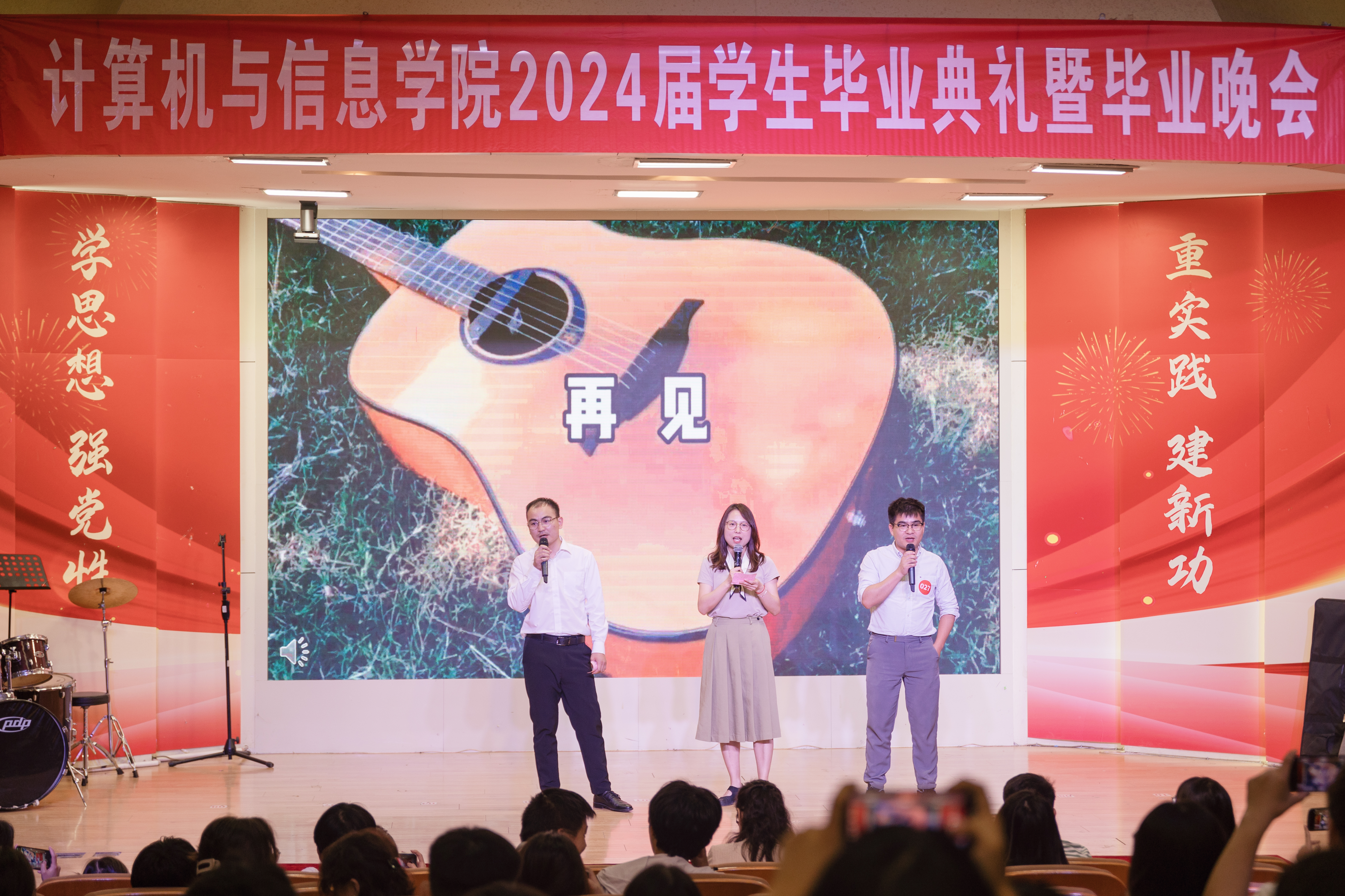 为给即将远行的毕业生留下更难忘的回忆,毕业典礼结束后,学院精心准备了毕业欢送会。物联网201李杰、计算机201唐彬峰、数据科学202李阳、计算机202杨凌轩倾情献唱,为大学生涯画下完美句号。毕业班辅导员魏晓飞、陈涛、孙力力在欢送会最后合唱《再见》,希望和毕业生们相聚有时,后会有期。互动环节,学生会“青年之家”准备好了祝福卡片,当场随机抽取明信片送给即将离校的学长学姐,卡片上写满学生会人员在学院范围内征集的祝愿与祝福,希望学院2024届毕业生在新的征程上展现青春作为、彰显青春风采、贡献青春力量,奋力书写中国式现代化挺膺担当的青春篇章。