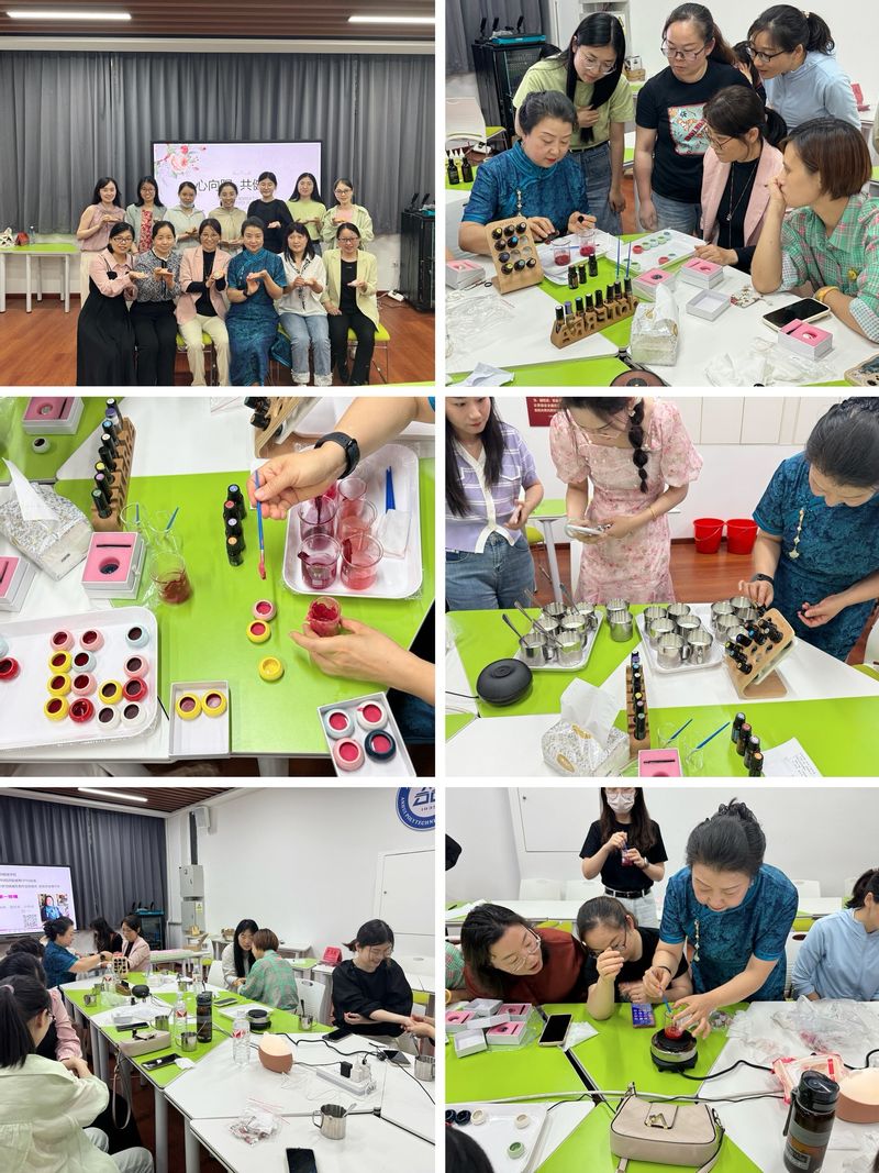 邬红芳向大家普及了精油的功效和日常使用方法,并通过吸、嗅、涂、抹的疗愈方法让大家现场感受精油的魅力。体验结束后,她详细介绍了椰子油、蜂蜡、色粉、精油等材料的配方比例和口脂制作步骤,大家跃跃欲试,挑选心仪的色号,在邬教授的专业指导下,一个个古法口脂应运而生。从颜色选择到模具定型,制作过程中大家感受到手工的魅力,在紧张的工作之余舒缓压力、陶冶情操。