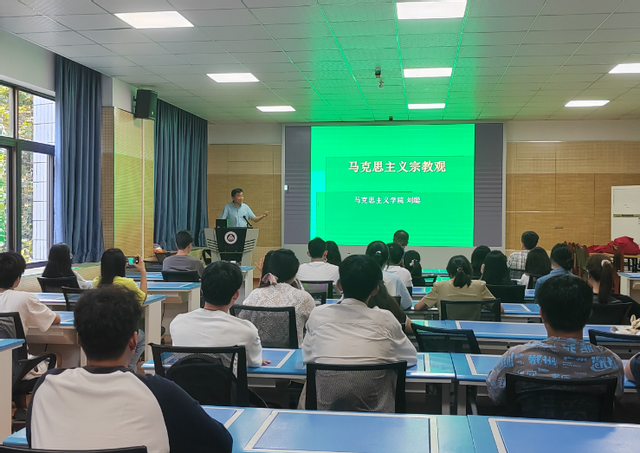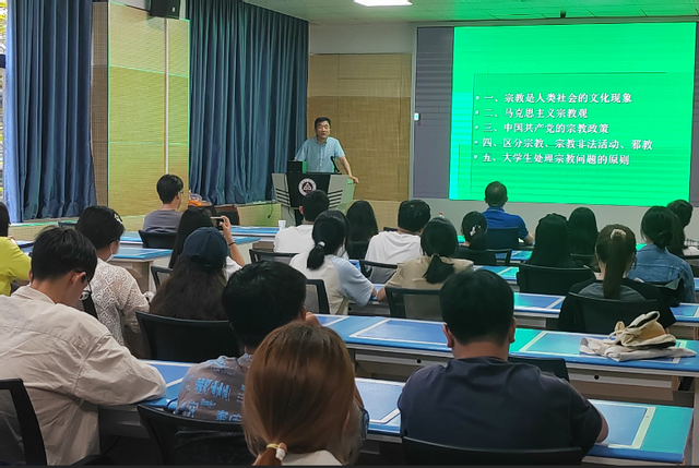 刘聪教授回顾了宗教的起源与发展,强调宗教作为人类社会文化现象的重要地位。他通过详实的史料和生动的案例,向师生们展示了宗教在不同历史时期、不同社会背景下的复杂面貌,使大家对宗教有了更加全面深入的认识。刘教授深入剖析了马克思主义宗教观的核心要义。他指出,马克思主义宗教观是在科学世界观和方法论指导下形成的,是对宗教本质、作用和发展规律的深刻揭示。他详细阐述了马克思主义宗教观的基本观点,包括宗教的产生、宗教的本质、宗教的作用以及宗教的未来等方面,使师生们对马克思主义宗教观有了更加清晰、准确地理解。在讲座中,刘聪教授还特别强调了大学生处理宗教问题的原则。他指出,在社会主义社会,宗教仍然存在并发挥着一定的作用,但宗教必须服从和服务于社会主义事业。他要求师生们要树立正确的宗教观,既要尊重和保护公民的宗教信仰自由权利,又要坚持宗教与社会主义社会相适应的原则,共同推动社会主义事业的繁荣发展。除理论讲解外,刘聪教授还结合当前社会热点和实际问题,对师生们进行了生动的案例分析。他通过讲述一些发生在身边的真实故事,使大家清楚地区分宗教、宗教非法活动、邪教。同时,他也就如何正确处理宗教问题、维护社会稳定和民族团结提出了宝贵的建议。