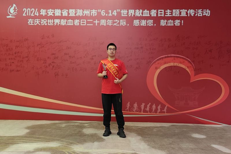 本网讯 在庆祝世界献血者日二十周年之际,6月12日,安徽省卫生健康委员会、安徽省红十字会等8家单位联合主办“安徽省2024年无偿献血公益之星与先进集体评选活动”。我校生物与食品工程学院生物工程专业王建韬同学荣获“安徽省2024年高校学生无偿献血先进个人”荣誉称号。