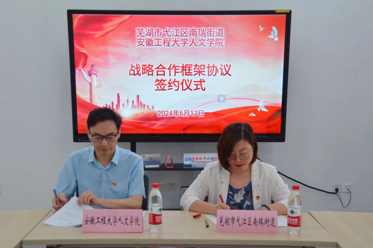 本网讯 6月17日,人文学院与芜湖市弋江区南瑞街道战略合作框架协议签约仪式在南瑞街道党群服务中心四楼会议室举行。人文学院院长刘军与南瑞街道党工委书记孙亚敏代表双方签署协议,仪式由南瑞街道党工委副书记谢欢欢主持。