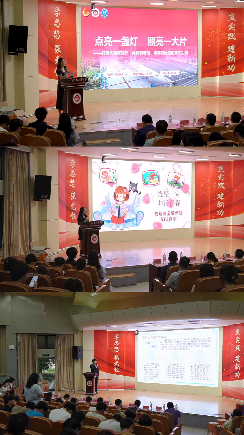 “华彩青春”分享会环节,“十佳大学生”金融211阮友慧介绍了她的成长经历,围绕学生工作经验展开分享,在踏实为学生服务的,同时探索服务新模式,勇于创新。“我们的宿舍故事”演讲比赛一等奖获奖者,统计231班刘书文介绍了她的宿舍生活,分享了宿舍中的温馨故事,充分展示了宿舍积极向上、和谐友爱的氛围。“十佳心理委员”统计222班王奕帆则分享了他关于心理健康工作的几点思考和典型做法。