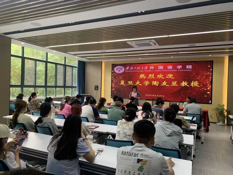 本网讯 6月21日,外国语学院邀请了复旦大学陶友兰教授做了题为“知行合一,译思并举:人工智能时代的翻译项目案例教学”的讲座。讲座由外国语学院副院长(主持工作)唐雪梅教授主持,外国语学院全体教师、部分研究生及本科生参加了讲座。