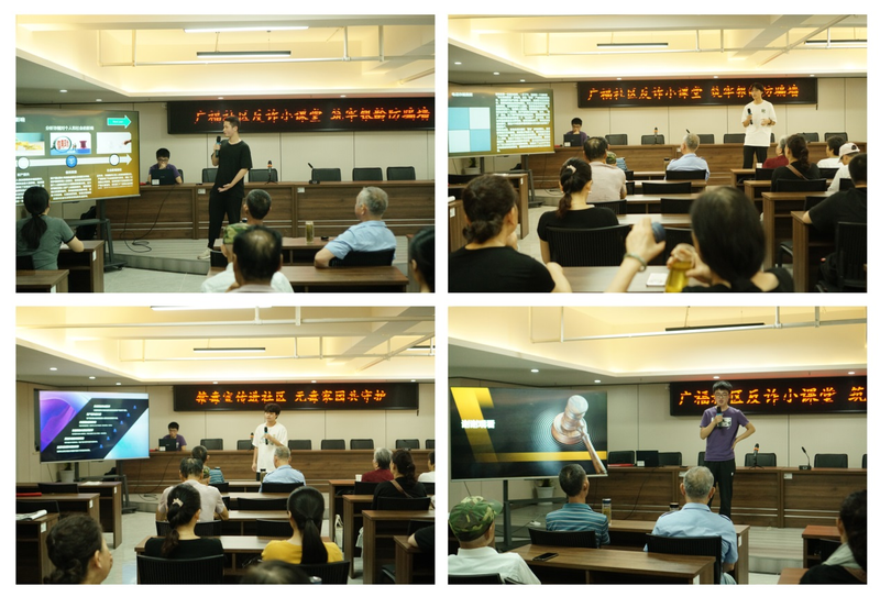 活动以“共筑普法反诈城墙”为主题,共分为五个环节。团队成员轮番上阵,从诈骗定义、常见诈骗手段、诈骗案例、防诈技巧,国家反诈中心APP的使用方法等多个角度进行了生动解说,引导社区居民识别诈骗陷阱,提高反诈意识。