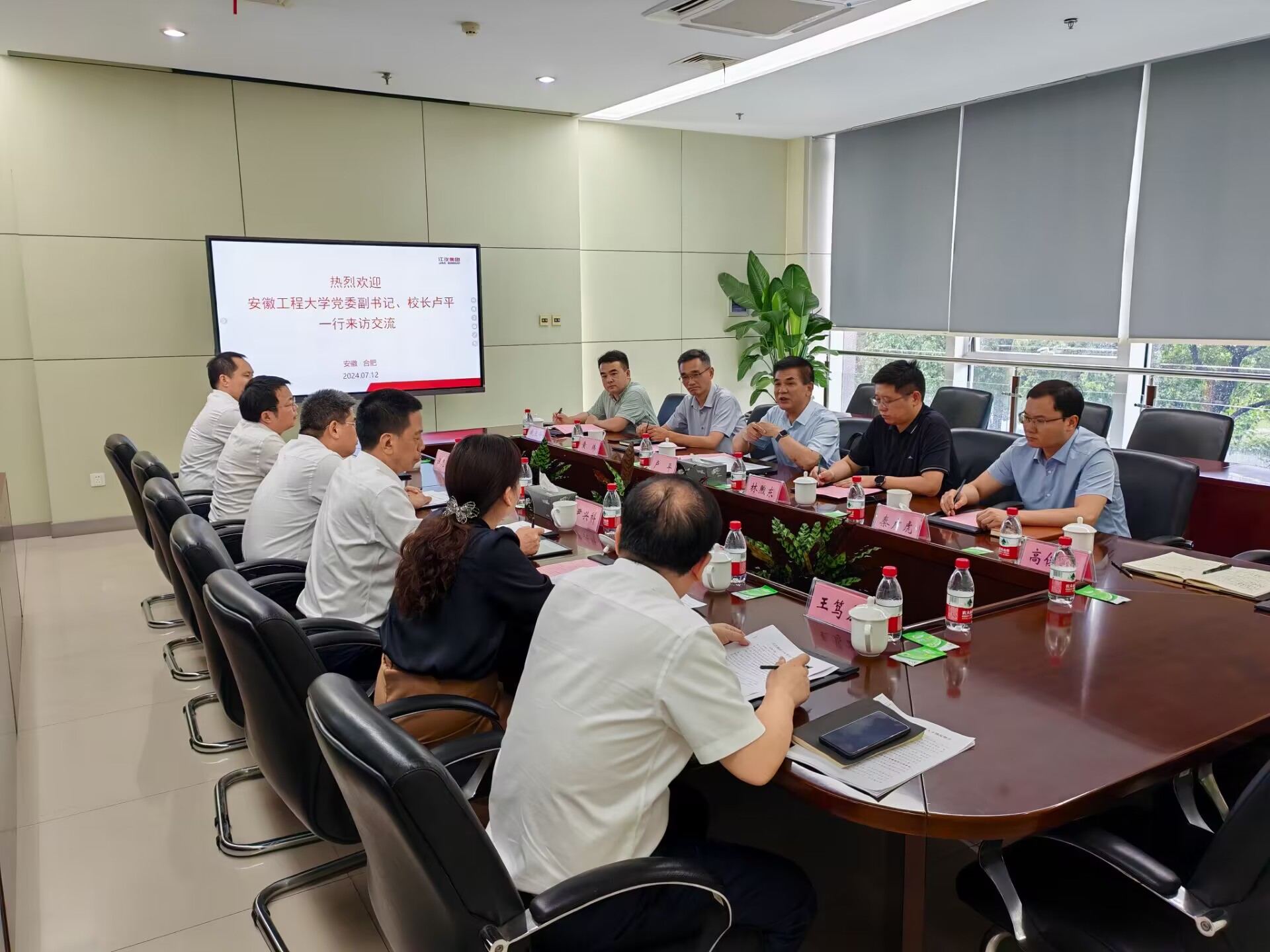 本网讯 为进一步贯彻落实教育部关于深化高校访企拓岗促就业行动工作要求,推动学校就业工作提质增效,7月12日,校党委副书记、校长卢平带队赴安徽江淮汽车集团股份有限公司、安徽众合半导体科技有限公司开展访企拓岗活动,并走访看望校友。江汽集团党委副书记、工会主席、董事许远怀,集团副总经理、校友尹兴科,安徽众合半导体科技有限公司董事长、校友纵雷,合肥市汇信机电设备有限公司总经理、校友毛磊参加座谈会,办公室、学工部、机械与汽车工程学院负责人陪同走访。
