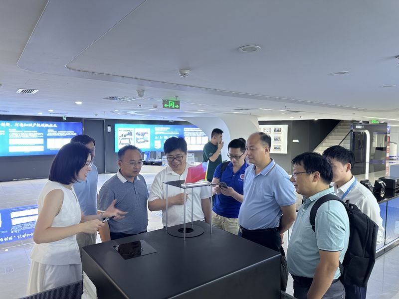 在东超科技有限公司联合总裁黄磊一行陪同下,调研组走进东超科技企业展厅,现场体验“无介质空中悬浮成像”技术在智能座舱、医疗卫生、民生工程、智慧家居、展览展示等领域的最新创新成果。
