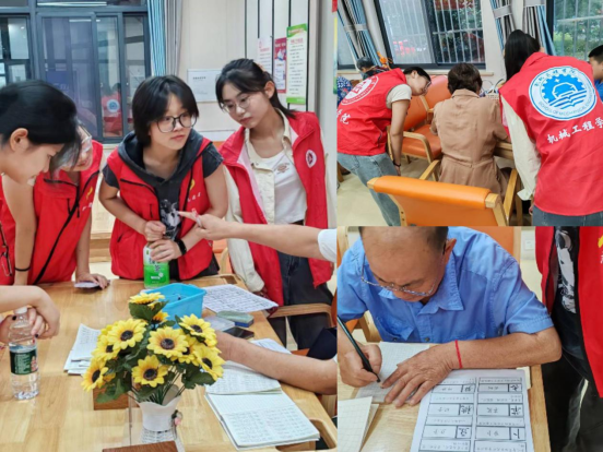 志愿者们走进社区医养中心,组织了一场“银龄课堂——同绘五彩夕阳”的老年教育活动。在银龄教师刁汉杰老先生的生动课堂中,每一位学生认真听讲,就像是回到少年时期,好学、敢问,一停一顿,写好每一个字。团队成员在旁协助,帮助老人们认字写字,耐心辅导,让老人们在轻松娱乐的氛围中掌握认字技能。