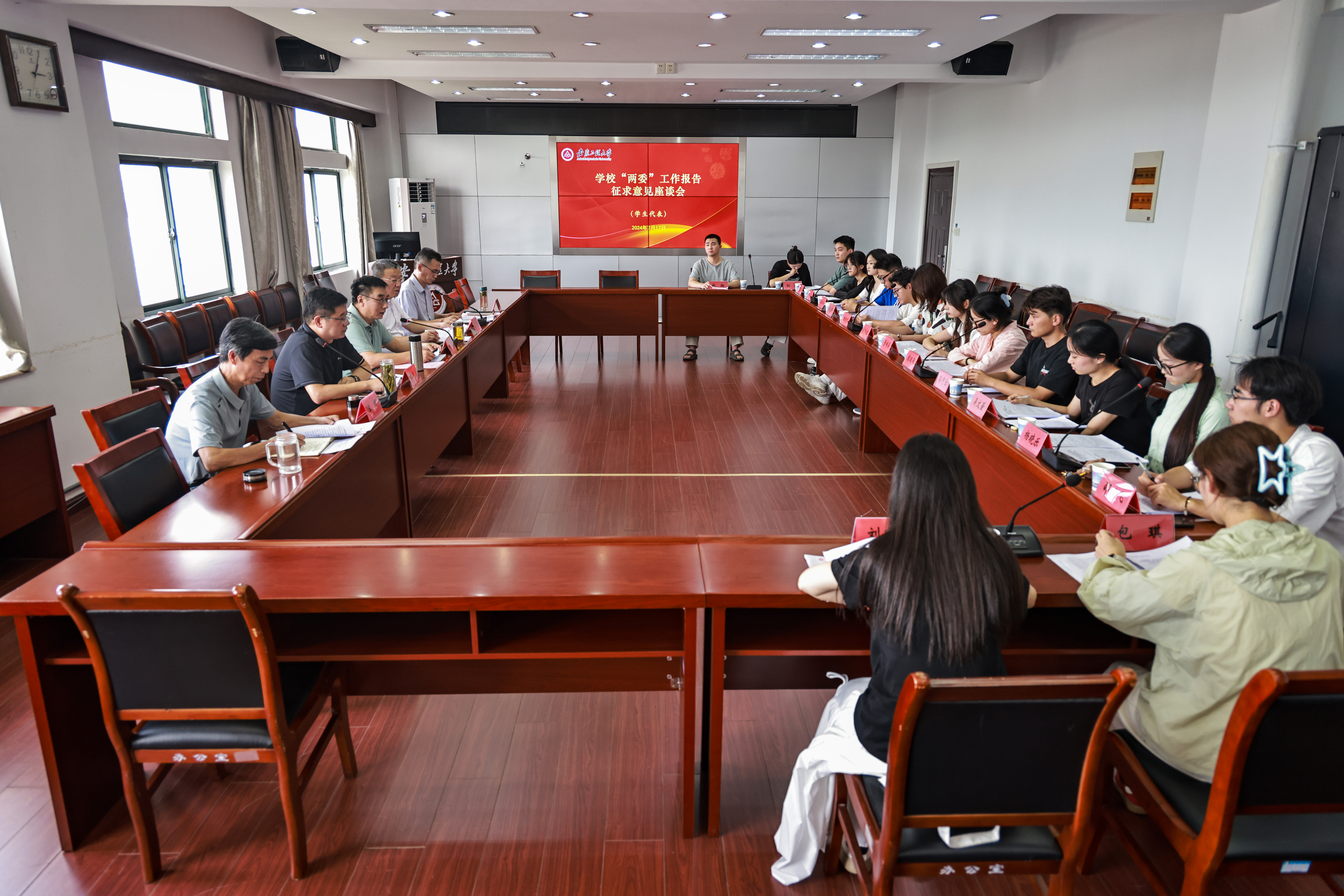 本网讯 7月17日至19日,学校召开“两委”工作报告征求意见座谈会,听取学校师生意见。校党委书记张志宏,校党委副书记、校长卢平出席会议,校党委副书记苏国红,校党委常委、副校长郑健,校党委常委、纪委书记、监察专员程双四,校党委常委、副校长凤权,各学院党政主要负责人、各职能部门主要负责人、党外人士代表、教职工代表、学生代表、部分党代表、离退休教职工代表等分别参加分类别座谈会,张志宏、卢平、苏国红、郑健分别主持会议。