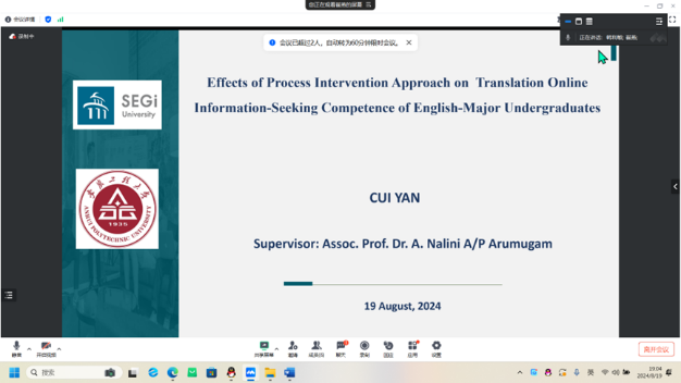 本网讯 8月19日,外国语学院在读博士崔燕老师做了题为“Effects of Process Intervention Approach on Translation Online Information-Seeking Competence of English-Major Undergraduates”的在线讲座。外国语学院副院长韩利敏出席讲座,讲座由外国语学院语言教学心理机制研究学术团队负责人杨晓丽老师主持,外国语学院相关教师参加了讲座。